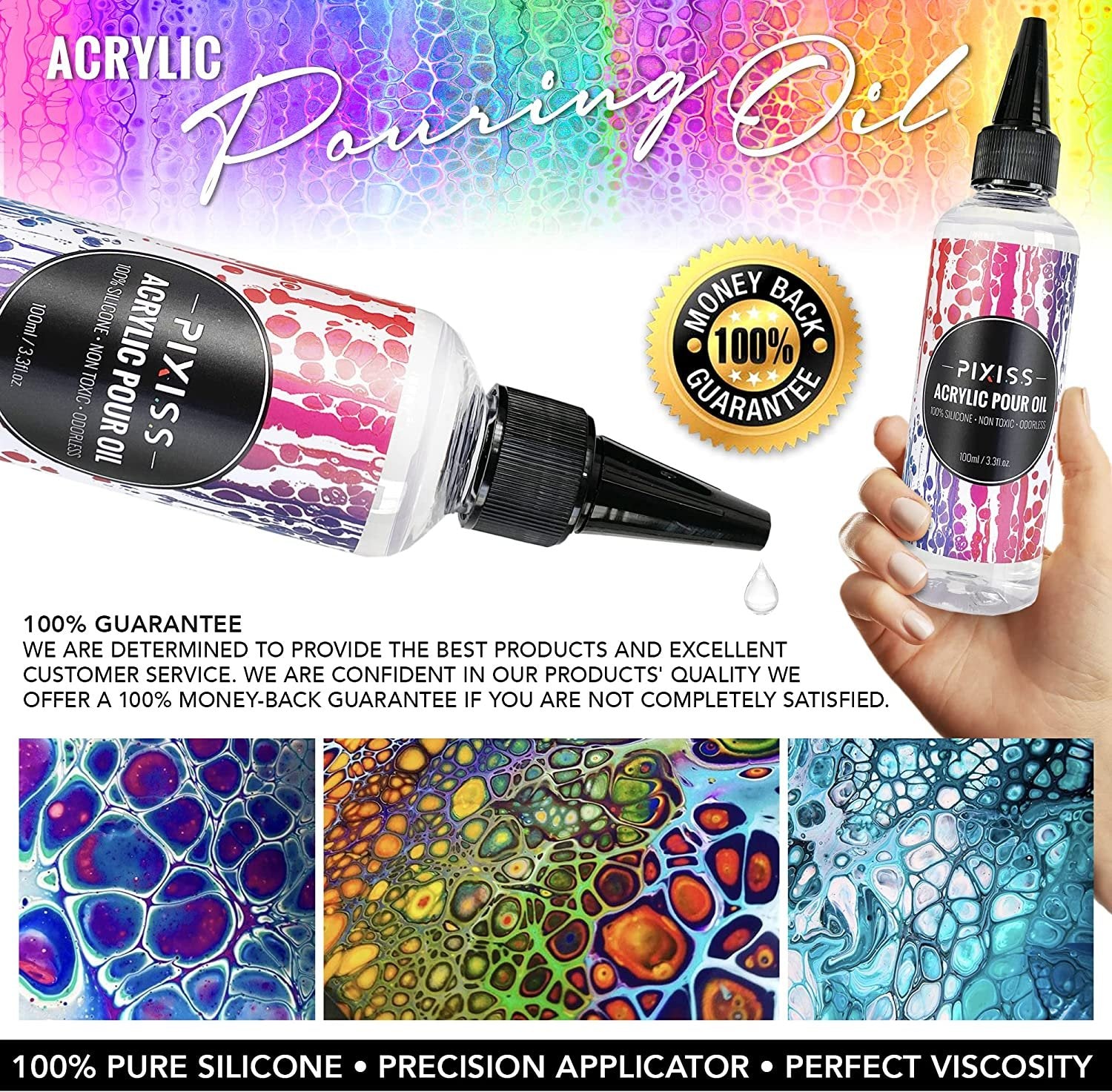 - 💦 ACRYLIC POURING VISCOSITY - Pixiss Acrylic Pouring Oil is silicone liquid fully compatible with any brand and type of art medium used in acrylic fluid art pouring. 1000 cSt Low-Med viscosity. Our acylic pouring oil represents the ideal weight and thickness for acrylic art applications.