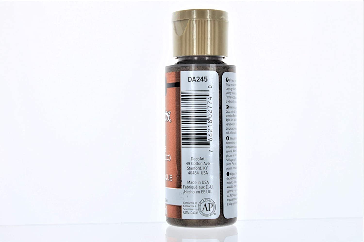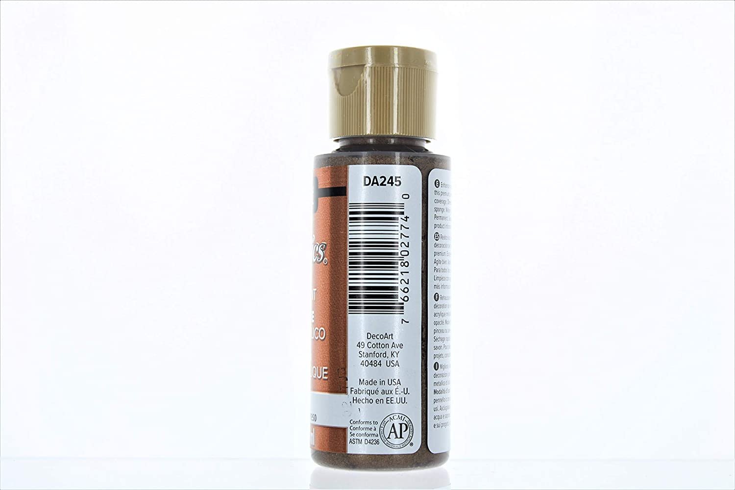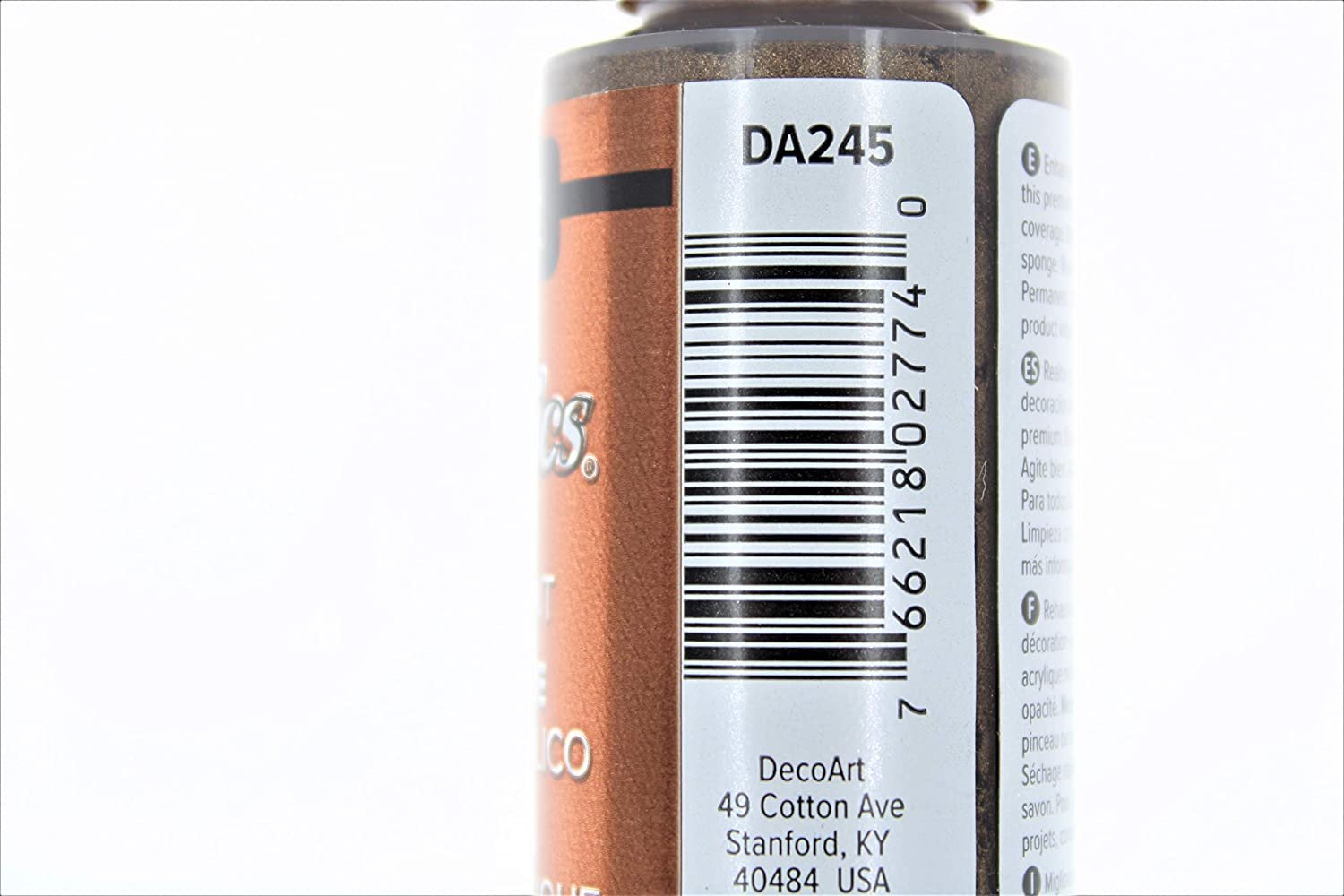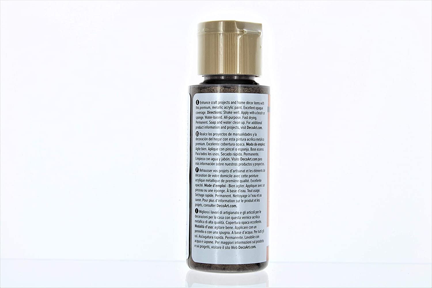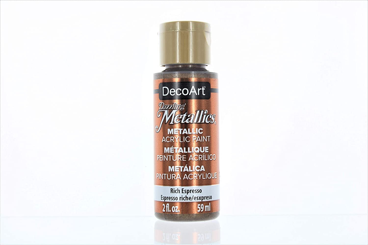 DECOART - Dazzling Metallics Acrylic Paint. An acrylic paint that is made from finely ground metal flakes. These flakes make Dazzling Metallics the brightest, best covering paint for adding metallic accents to most projects. Dazzling Metallics are available in a palette of bright, glimmering colors from delicate translucent pastels to deep rich, shades. Dazzling Metallics can be used on virtually any craft surface, like frames, lamps, vases, figurines, candles, candle holders and fabric. This package contains 2oz/59ml. Contents conform to ASTM D4236. Made in USA.