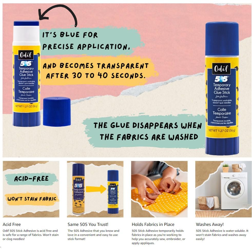 Apply the 505 glue stick to fabric, ensuring even coverage. Use the Pixiss fabric clips to hold fabrics together while sewing or crafting. Once finished, the temporary adhesive will wash out, leaving no residue. Care Instructions:
