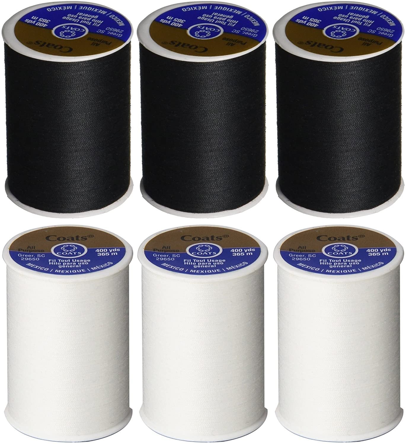 6 Pack Bundle - (3 Black + 3 White) - Coats & Clark Dual Duty All-Purpose Thread - Three 400 Yard Spools Each of Black & White