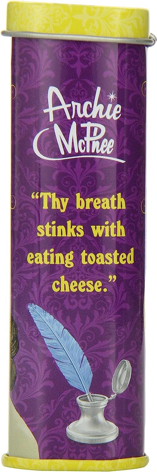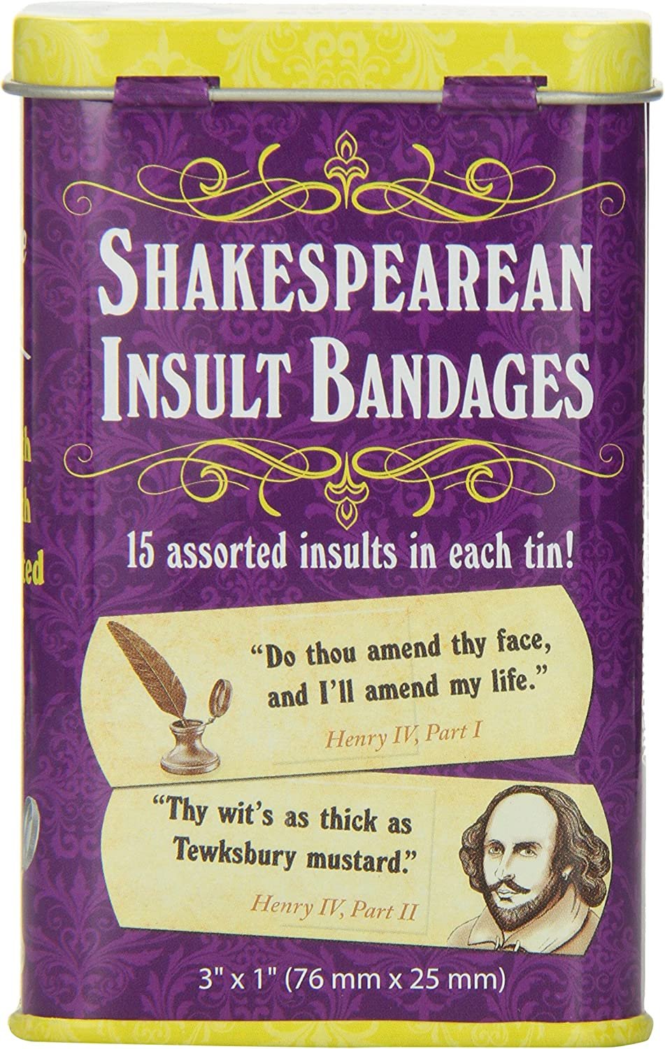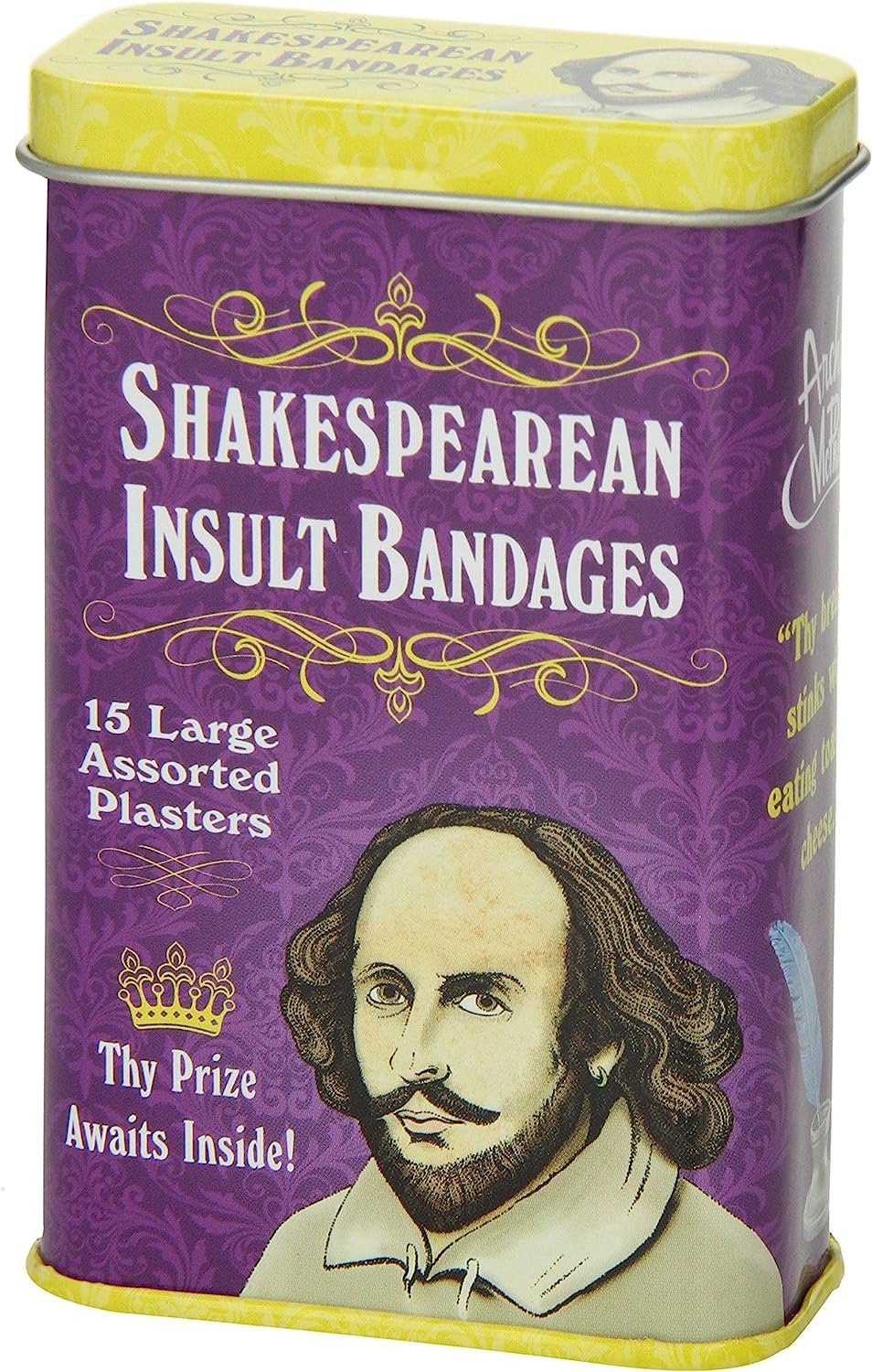 Even knaves, rascals and scoundrels get scrapes and cuts that require bandages. This set of fifteen 3" x 1" (7.6 cm x 2.5 cm) assorted plasters (British for bandages) are decorated with an image of Shakespeare and one of fifteen insults from his plays. Comes in a 3-3/4" (9.5 cm) tall metal tin with a Free Prize. Latex-free adhesive. Twelve shrink wrapped tins in each illustrated display box.