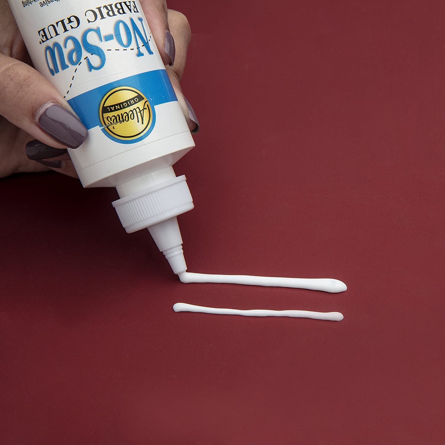 Aleene's no sew fabric glue. This glue is perfect for basting and temporary stitching, and quick repairs. Make your creative ideas stick with this specialized glue. It's ideal for use on both natural and synthetic fabrics. Try it on ribbons, trims, felt, and quilting projects, too. Nontoxic. 4 ounces.