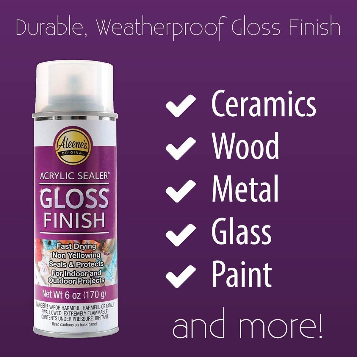 Keep your projects looking picture perfect with Aleene’s Spray Acrylic Sealer This durable, versatile sealer provides a clear glossy finish on both indoor and outdoor surfaces for weatherproof protection you can count on. The spray-on acrylic formula applies evenly and dries quickly with a shiny gloss finish. - See more at: s://.aleenes/aleenes-spray-acrylic-sealer-spray-sealer-gloss-6ozsthash.xxn29kRk.dpuf