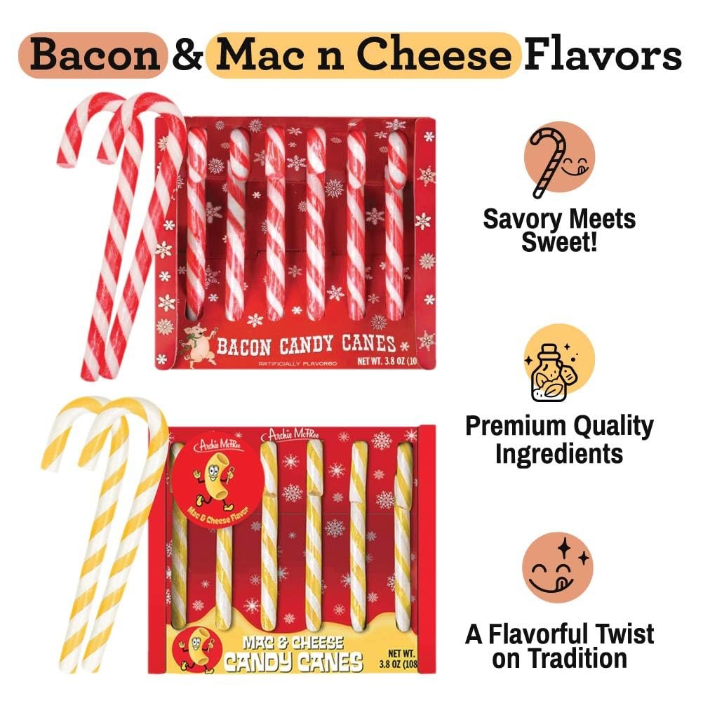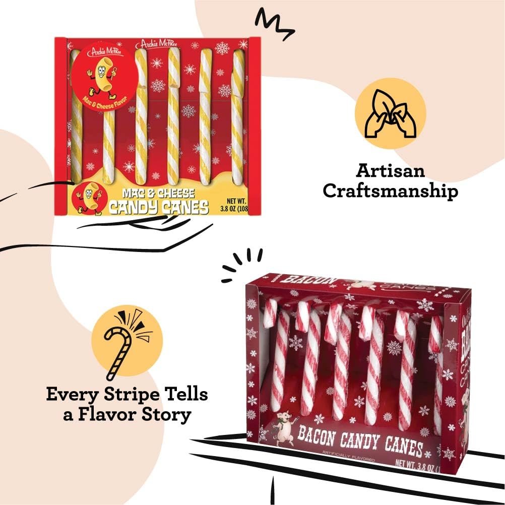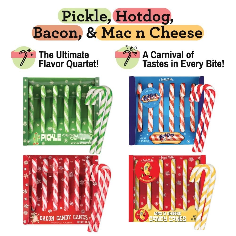 Introducing the ultimate flavor fusion with our Pickle, Hotdog, Bacon, and Mac n Cheese Candy Canes. This all-in-one pack is a celebration of taste, offering a delightful blend of savory and sweet that promises to tantalize your taste buds. Each candy cane captures the essence of its inspiration, turning every bite into a unique taste adventure. Crafted with precision and passion, our candy canes are more than just confections; they're a journey of flavors waiting to be explored. Whether you're a fan of the tangy twist of pickles, the savory bite of hotdogs, the smoky allure of bacon, or the comforting taste of mac n cheese, this pack has something for everyone. And their appeal goes beyond just flavor. As gifts, they're the epitome of novelty, perfect for those who appreciate the unexpected. Beyond their delightful taste, these candy canes are a testament to our commitment to quality and sustainability. Made with premium ingredients and eco-friendly practices, they ensure a taste sensation that's as kind to the palate as it is to the planet. They're not just treats but conversation starters, perfect for festive gatherings, themed parties, or casual meetups. So, if you're looking to embark on a culinary adventure, surprise a loved one, or simply indulge in a medley of flavors, our Pickle, Hotdog, Bacon, and Mac n Cheese Candy Canes are the perfect choice. Dive into a world of taste, where tradition meets innovation, all wrapped up in one delightful package. Experience the ultimate flavor fusion and elevate your candy experience.