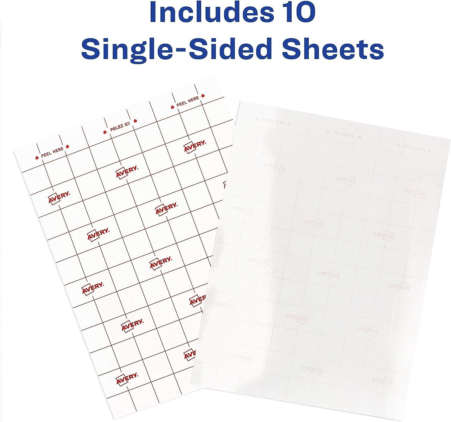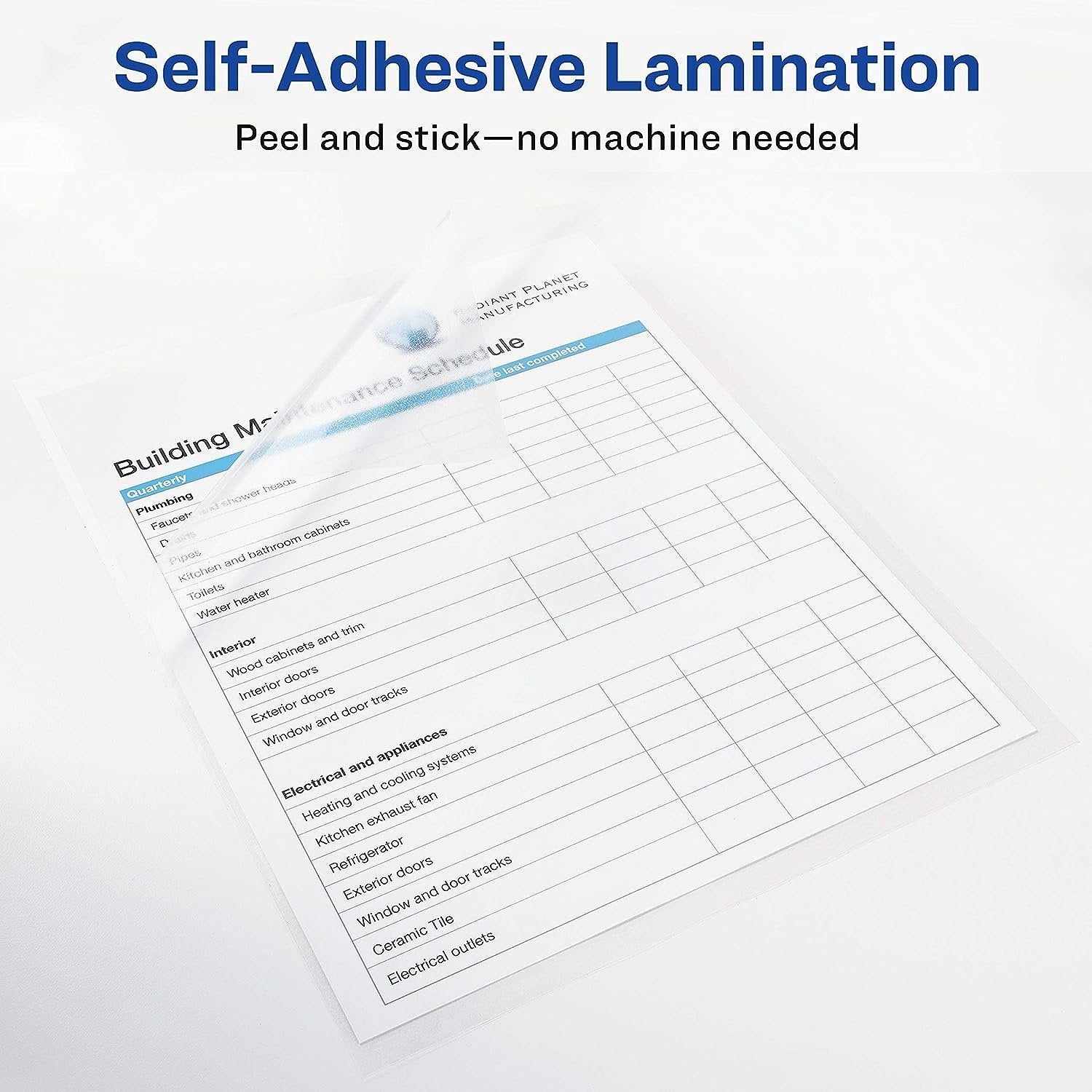 Easily, quickly and inexpensively laminate important documents, precious photos, valuable cards and more using these clear self-laminating sheets. Each 9" x 12" laminate sheet is coated with permanent self-adhesive so you can effortlessly create professional quality laminations without having to fuss with lamination machines. Laminating is simple: use the included grid to size the document, place the document on the adhesive side of a laminating sheet, lay the second sheet with its adhesive side down to seal the other side of the document and trim the edges. Made from acid-free and archival safe material, you’ll be able to preserve and protect documents, diplomas, artwork, photos, collector cards, signs, homemade crafts, stickers and more. You can even turn your laminated sheets into a dry erase board and use a dry erase marker to make notes on them directly. Whether you’re a business professional, teacher, student, hobbyist or collector, you’ll love how easy-to-use and inexpensive Avery lamination sheets are for all your quick laminating projects. Item comes with a total of 10 self-laminate sheets.