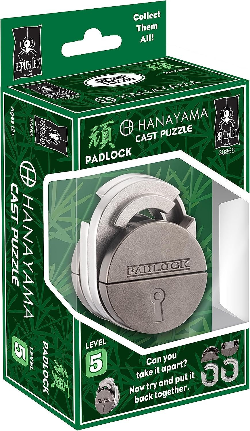 The Padlock design looks similar in size and weight to a lock one might find at the gym, but look out - there's no key or combination of numbers to solve this one! Just pick it up and you'll quickly gain an appreciation for the challenge that lies ahead - this puzzle will not open easily! The interior is comprised of two elliptical pieces, locked together tightly around the circular pieces and obstinately refusing to be released. But don't give up! This seemingly simple design may take hours to unravel - but your mission is only complete when you have put the lock back together again. The theme is "obstinacy." Designed by Korean designer JinHoo Ahn. Level 5 (out of 6) puzzles are considered difficult.