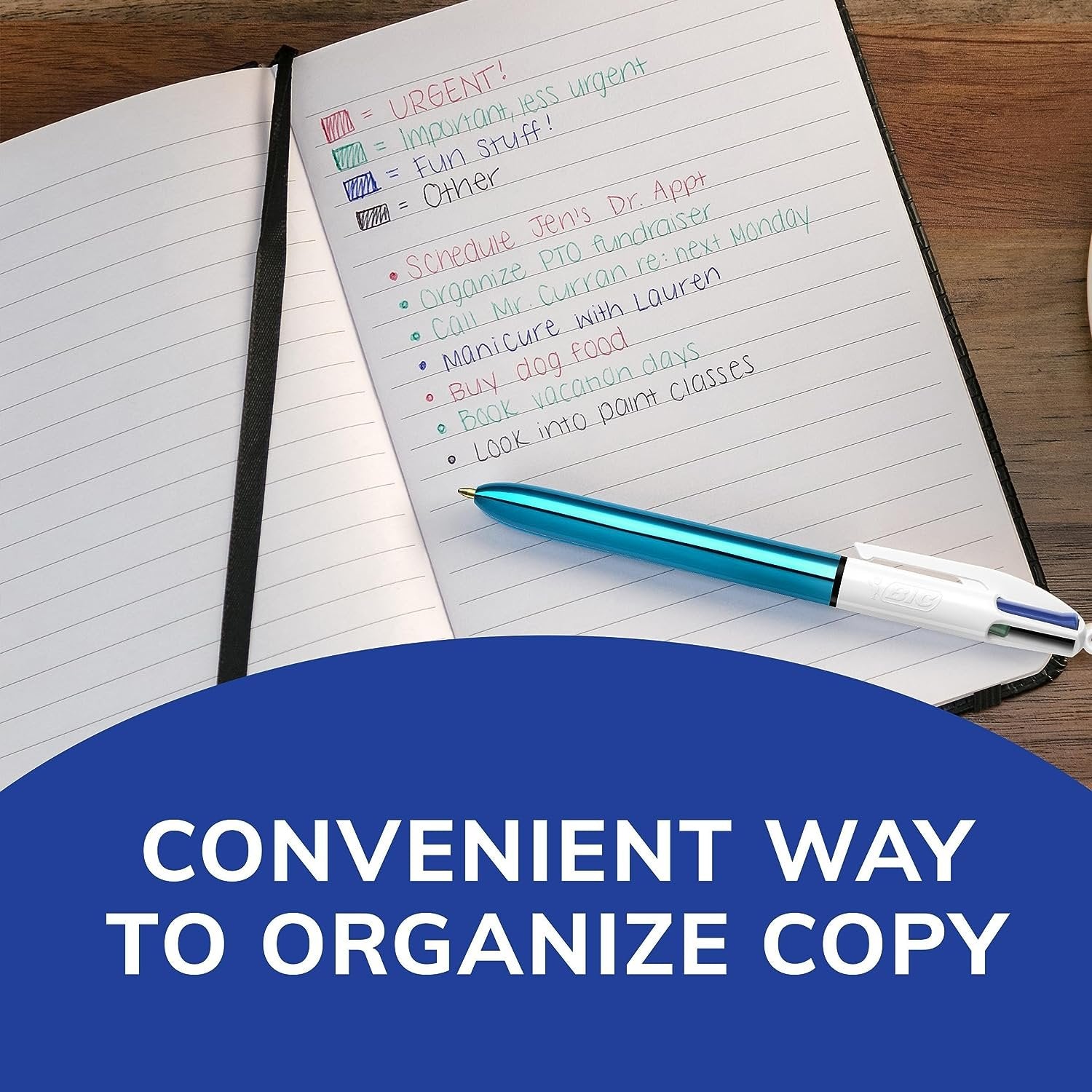 Experience long-lasting ink with BIC 4-Color Original Retractable Ball Pens. These 1.0mm medium point ballpoint pens are perfect for everyday writing at work, school or home and have long-lasting ink for all of your writing needs. With four different colors in the same pen, they’re the ideal ball point pens for writing lists, taking notes, journaling and more. BIC 4-Color Original Retractable Ball Pens are a smart choice for art or school supplies. Enhance your note-taking and organization skills with one of these versatile retractable pens. Plus, the plastic clip easily attaches to pockets, notebooks and more for quick access on the go. These BIC 4-Color ballpoint pens were designed for convenience so that you can have assorted pens without carrying around a stationery set. Even better, the retractable pens let you start writing with just one click. Each pen in this BIC pens bulk pack comes with a comfortable wide barrel. Looking for reliable pens for school or office supplies? Choose BIC 4-Color Original Retractable Ball Pens for a high-quality and affordable product you can trust.