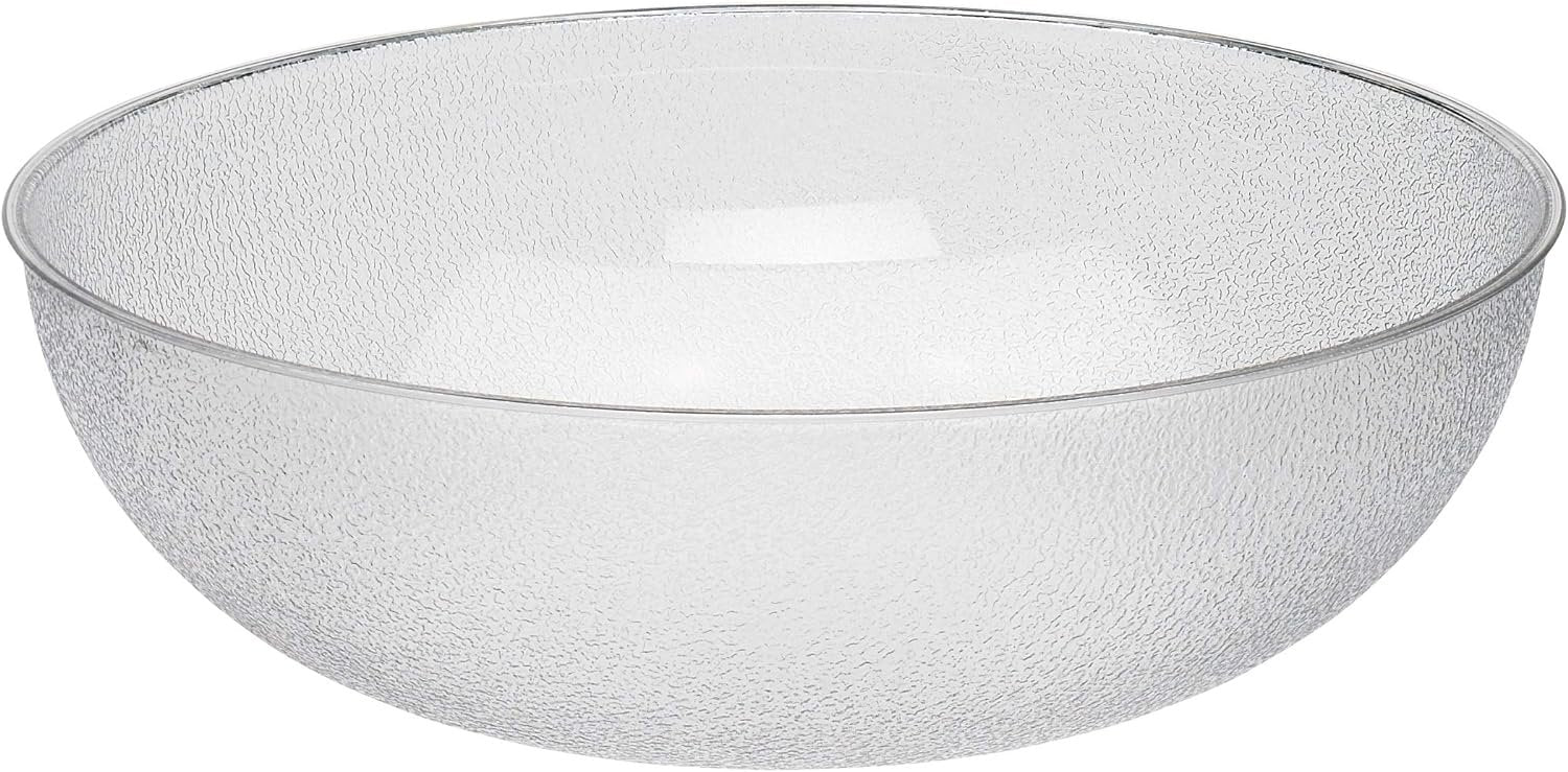 This round pebbled serving bowl is made of virtually unbreakable polycarbonate material. It is ideal for fruit, salads, snacks and desserts. Textured on the outside for an elegant look. It is very smooth on the inside for easy cleaning. NSF listed, break resistant with smooth interior. Fit in the Cambro salad bowl holders for Cambro food bars. Comes with 20.2-quart capacity. Measures 18-inch inside diameter.