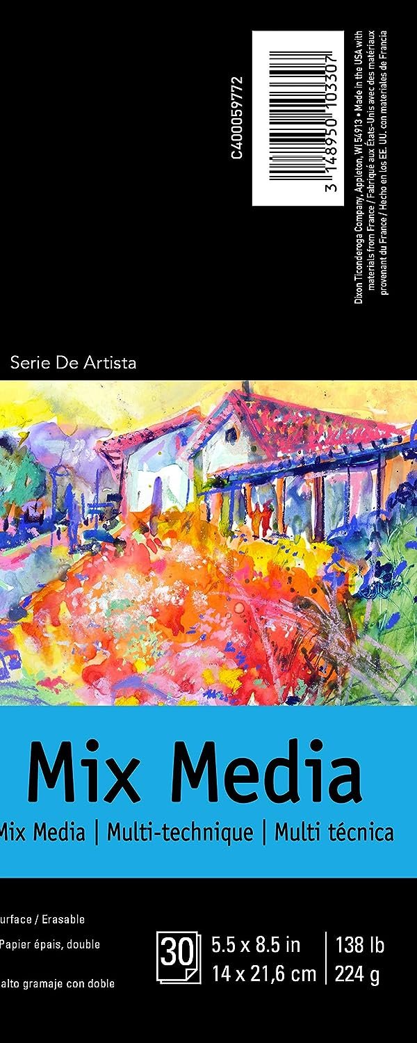 Canson Artist Series Mix Media Pads are sleek, newly-designed pads that feature a heavyweight, French-made mix media paper. This paper has two distinct surfaces, fine and medium texture, and is good for use with wet and dry media. The paper erases cleanly and is smudge resistant. Artist Series Mix Media Pads contain micro-perforated, true size sheets. They also feature an innovative, removable half-sheet that contains tips and techniques. This half-sheet can be reinserted and used as a bookmark. Each pad contains 30 sheets of 138 pound/224 gram acid free 5. 5 x 8. 5 inch paper.