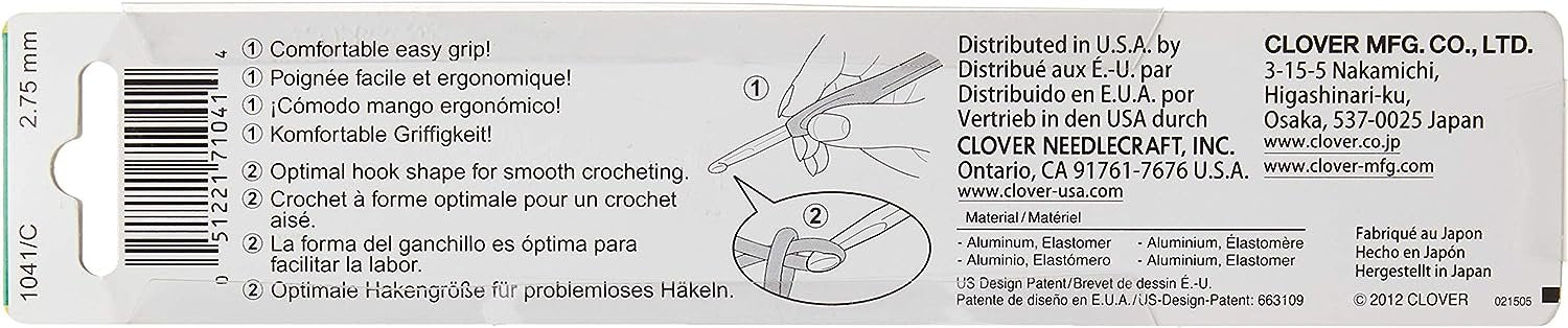 The Clover 1041/C Amour crochet hook is engineered to be the best hook ever. The incredibly smooth hook allows yarn to slide effortlessly and the new elastomer handle makes crocheting comfortable and stress free. These crochet hooks have color coded handles for easy size identification. This one is size C (2.75mm) and the handle color is yellow.