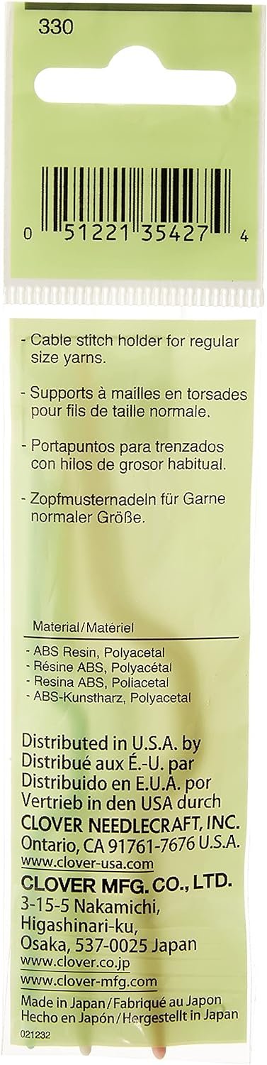 Clover-Cable Stitch Holders. Perfect for regular sized yarns! This package contains three 3-1/2 inch long cable stitch holders in small medium and large. Made of ABS resin. Imported.
