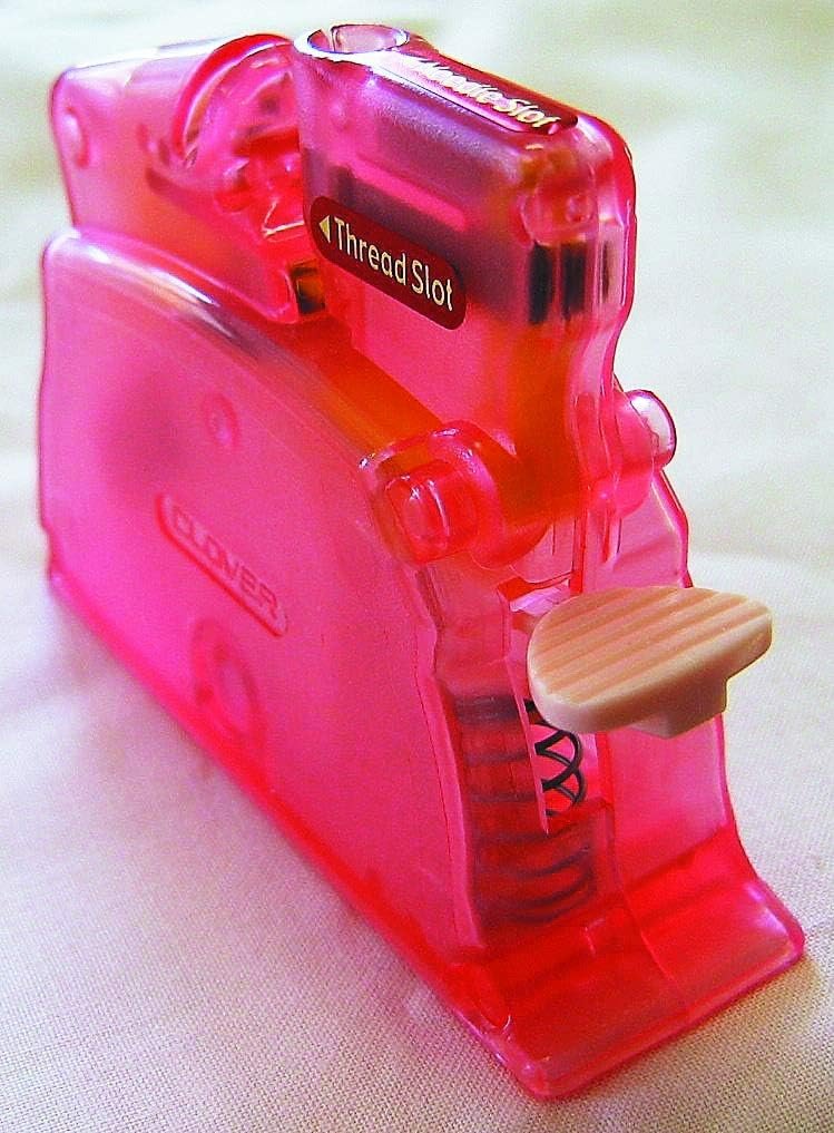Desk Needle Threader is the ultimate threader. Simply drop your needle in (any needle except tiny quilt petites) rest your thread in the slot press the button and you will have your pre-threaded needle. Ideal for difficult to thread floss and metallics and also for difficult to see needle eyes. Color: Pink. Made in China.