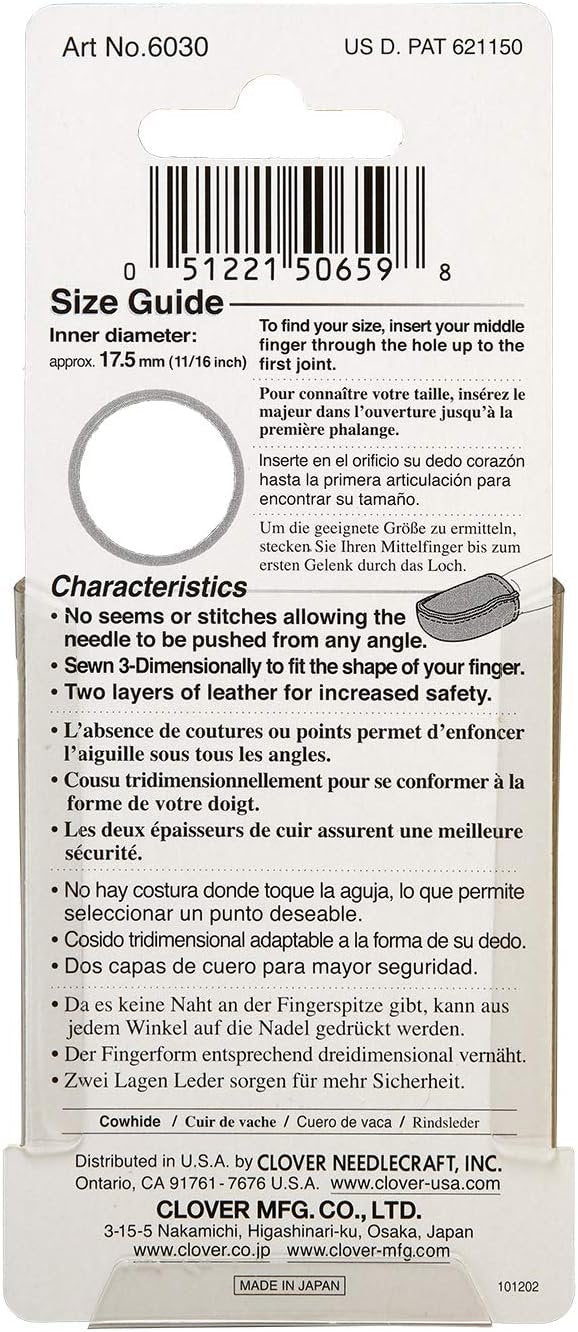 A new shape created to give you a perfect fit. A finger-shaped leather thimble from 3-dimensional stitching technology. No seams or stitches where the needle hits the thimble allowing the needle to be pushed from the most convenient spot. The unique shape creates a smooth curve from the edge of the fingertip to the middle of the finger for a cozy natural fit. Available in three sizes: each sold separately. Imported.