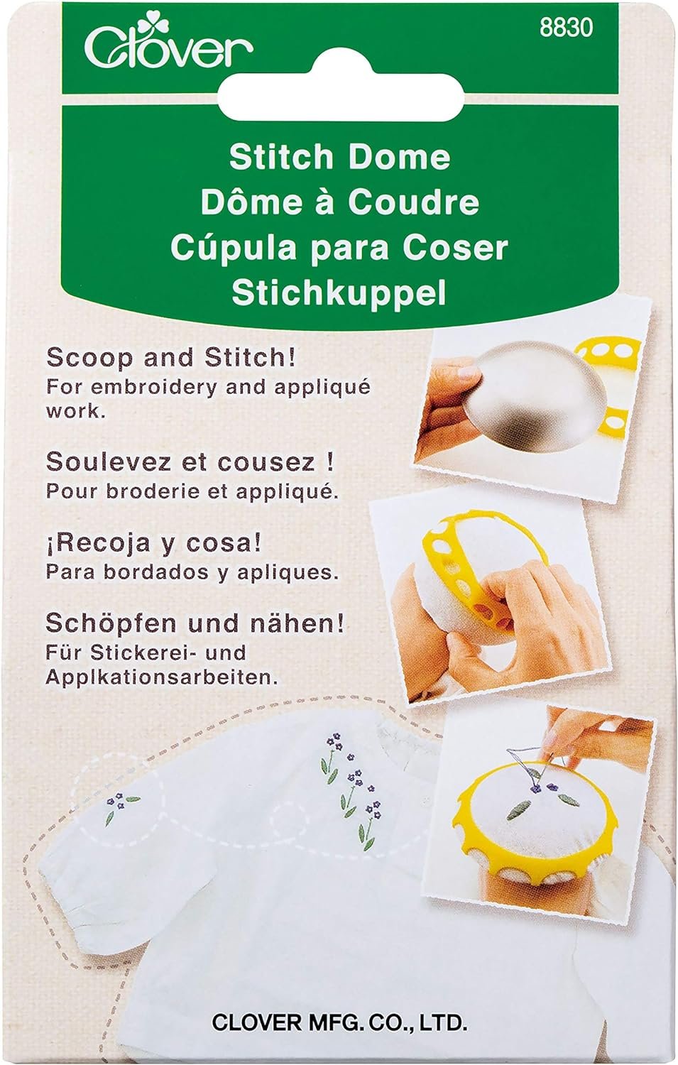Clover's stitch dome is perfect for embroidery and applique work, just scoop and stitch! It ensures consistent even fabric tension for smooth, precise, pucker free stitches. Designed for decorative applique and embroidery. Perfect to stitch in narrow spaces. Useful to stitch where it is difficult to set an embroidery hoop such as tailored pouches, shirt collars or sleeves of shirts.