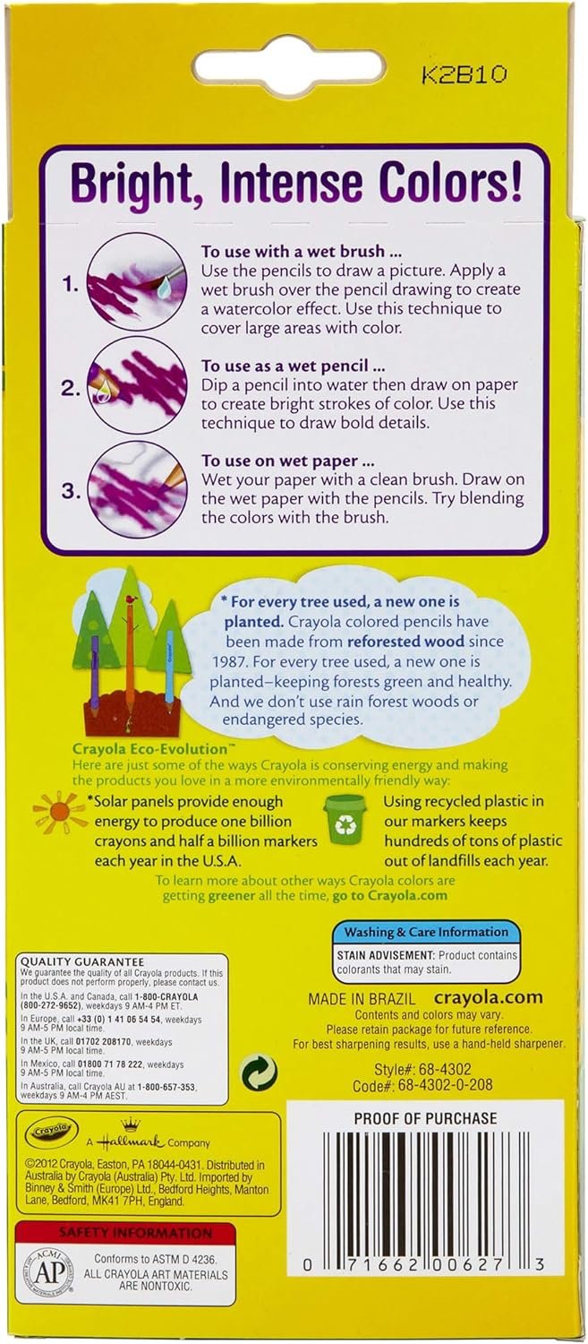 Crayola Watercolor Colored Pencils can be used wet or dry—all you need is a little imagination! Create watercolor effects by laying down dry color and using a paintbrush (sold separately), wetting the coloring pencils, or using them directly on wet paper. Pencil drawings transform into watercolor art in an instant! Colors include Red, Orange, Yellow, Light Green, Green, Light Blue, Blue, Purple, Pink, Brown, White, and Black. Pair with a Crayola Watercolor Pad (sold separately) for a great bundled gift for kids. Safe and nontoxic, ages 5 and up.