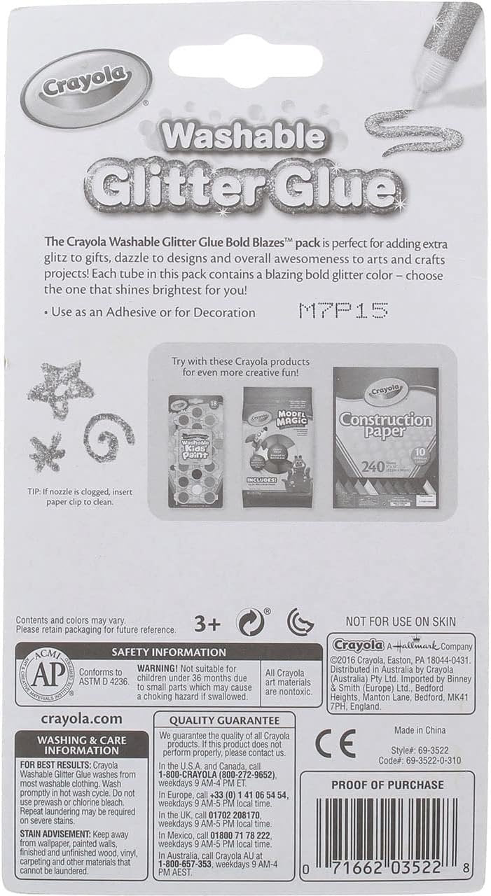 - CRAYOLA COLORS: This Art Glitter Glue set includes Red, Blue, Green, Silver, and Gold Glitter Glue.