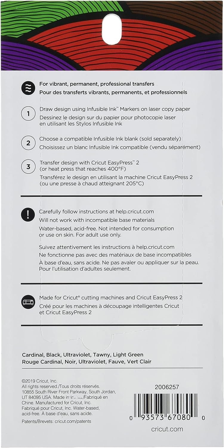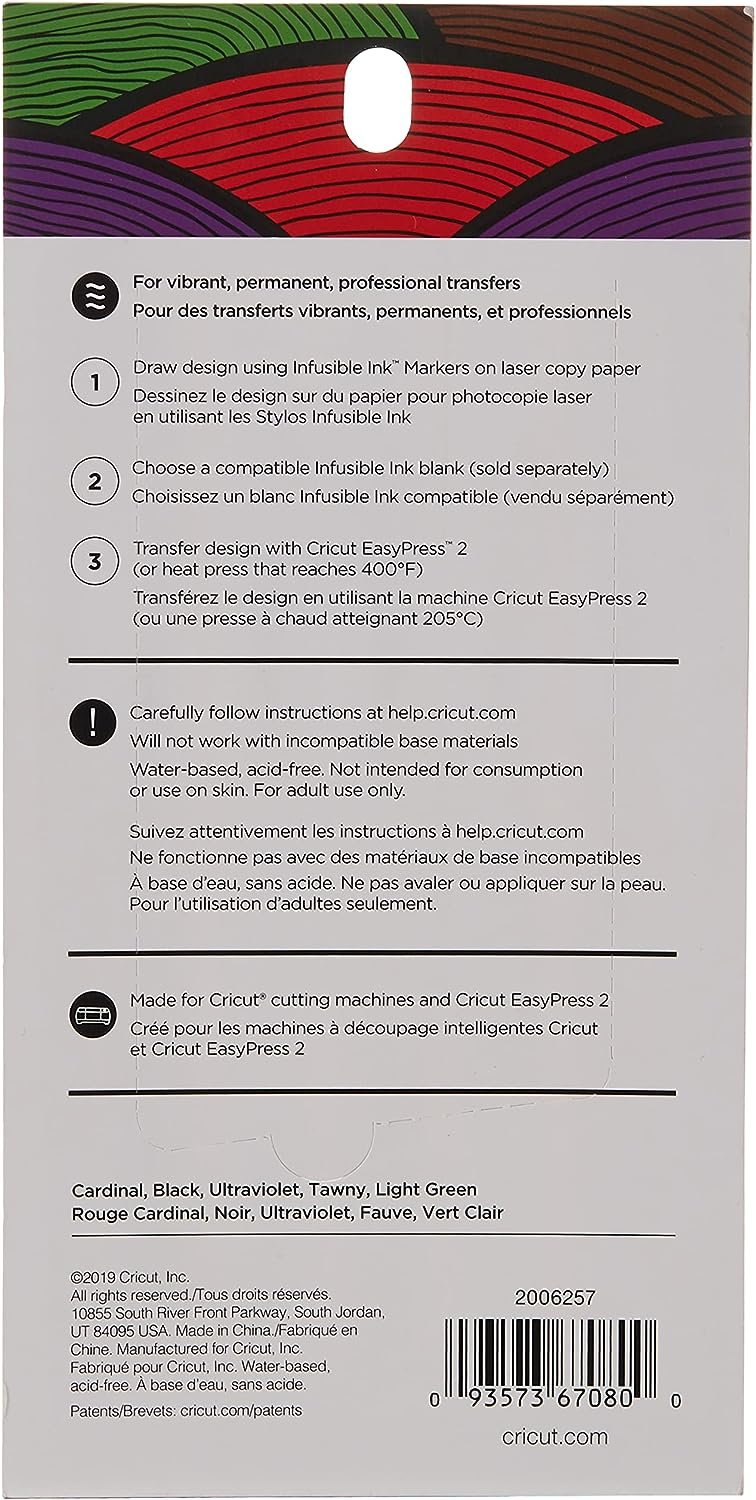 Apply heat and watch as your designs bloom into vibrant, permanent, pro-quality transfers on the Infusible Ink blank of your choice. Use these five vivid, fine point pens to draw intricate designs using your Cricut smart cutting machine on plain laser copy paper, or freehand your designs for a personal touch. What is the Infusible Ink process? Unlike iron-on transfers or heat-transfer vinyl that adheres to your project's surface, Infusible Ink designs become one with your base material, resulting in rich, full-color transfers that last a lifetime. Get a smooth, durable, premium finish that's always flake-proof, peel-proof, and wash-proof. Personalize and customize any compatible Infusible Ink blank with your name, your favorite logo, or an inspirational phrase that speaks to you. You've never done DIY like this before. How it works: 1. Draw design using Infusible Ink Pens on laser copy paper. 2. Choose a compatible Infusible Ink blank (sold separately). 3. Transfer design with Cricut EasyPress 2 or heat press that reaches 400°F (205°C).