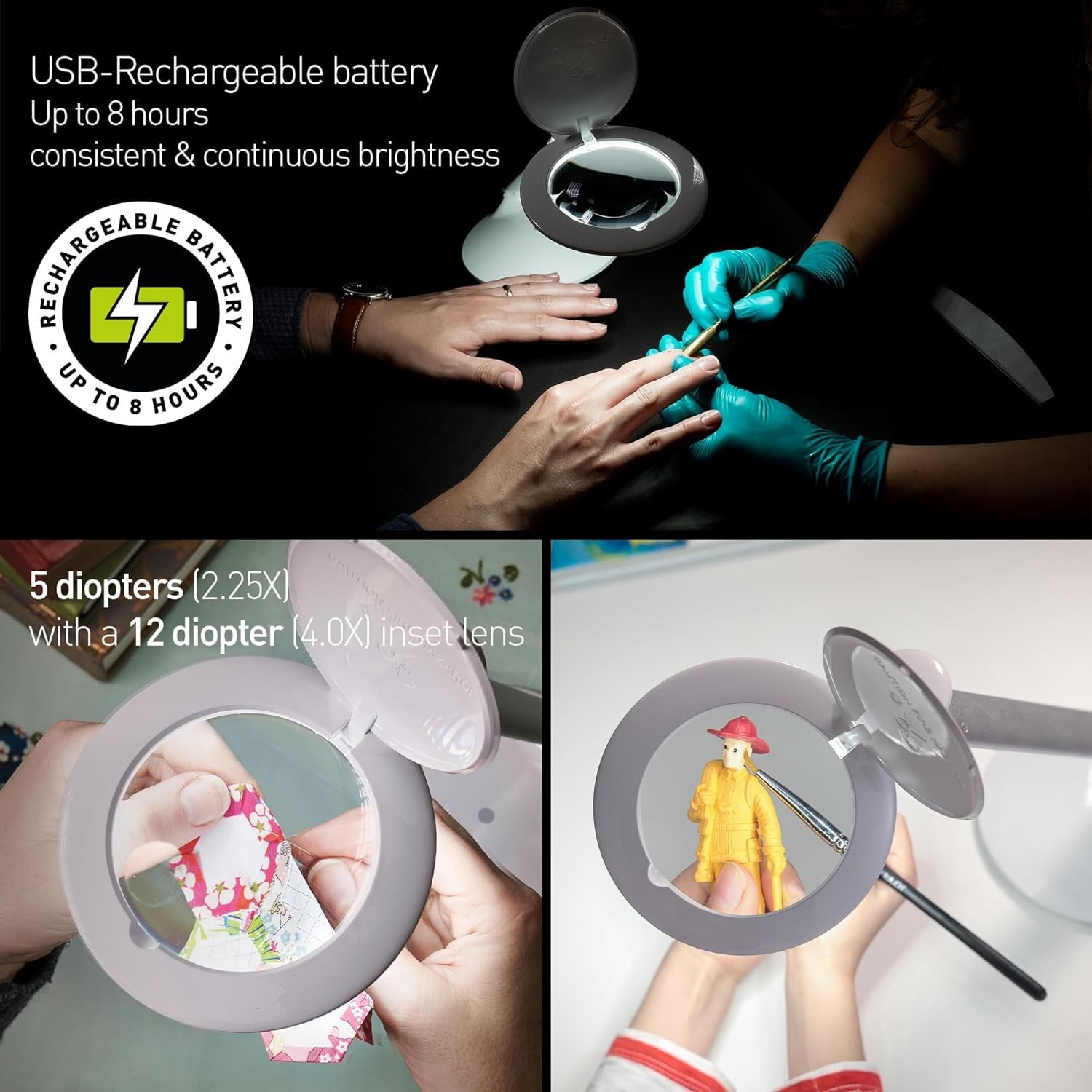 - RECHARGEABLE AND 2 BRIGHTNESS LEVELS - Our reading light is designed for portability, this lamp with magnifier is equipped with a USB rechargeable battery, providing up to 8 hours of consistent brightness. The LED lights are strategically placed around the magnification lens, ensuring uniform lighting across your entire project. With 5 dioptres (2.25X) magnification and a 12 dioptres (4.0X) inset lens, it enables you to work on even the finest details with ease.