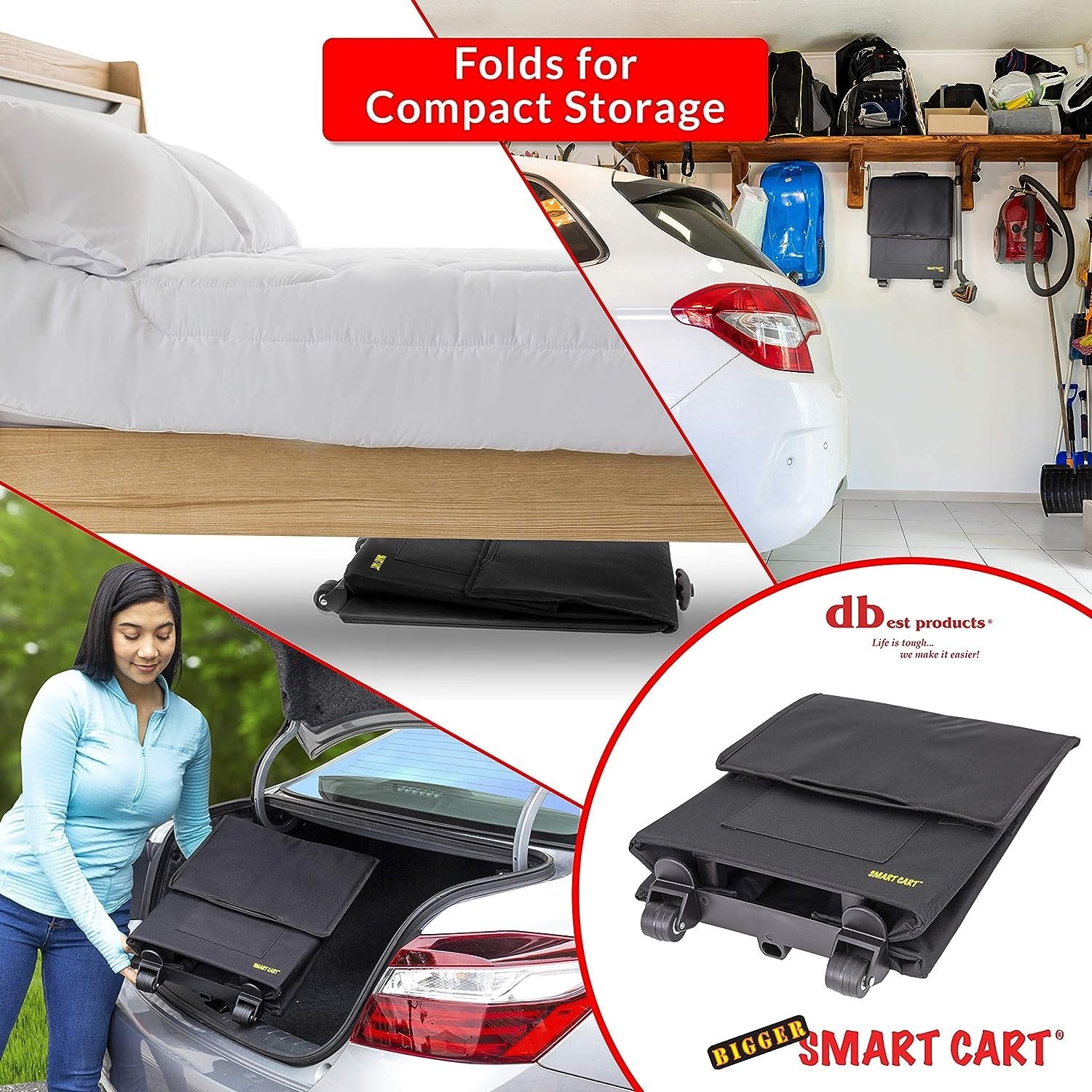 - Collapsible and Portable; Easily folds down in half for compact storage when not in use; Store in the trunk of your car, under the bed, in the closet or garage. Multi-functional Uses; Use it as a shopping cart, grocery cart, utility cart, foldable cart.