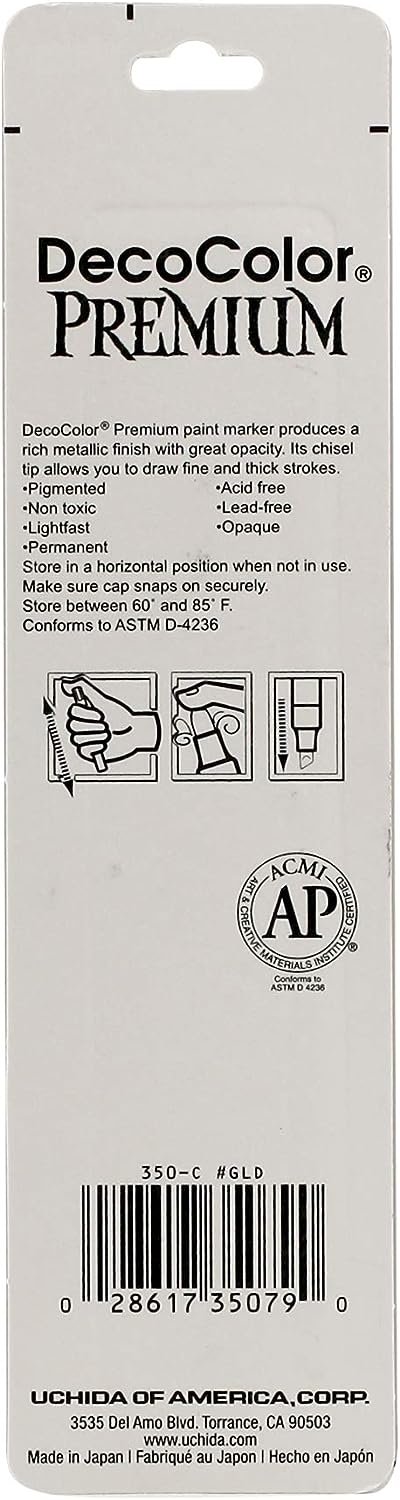 Uchida's DecoColor Premium pen produces a rich metallic finish with great opacity. The metallic finish reflects light and is great for leafing. This pen has a 3 way chisel point.