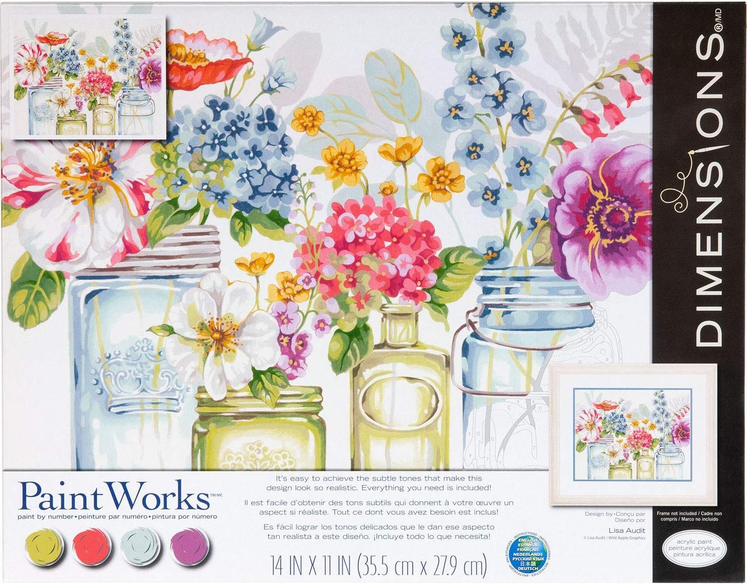 Paint your very own piece of floral wall art with the Dimensions Paintworks Rainbow Flowers Paint by Numbers Kit! This easy craft kit is tons of fun for kids and adults, and features a collection of pastel flowers in decorative jars painted in watercolor style. Gift this craft to a budding artist or put it on display to wow your friends and family! Includes high-quality acrylic paints, printed art board, paintbrush, and easy to follow instructions. Completed Rainbow Flower painting measures 14'' x 11''.