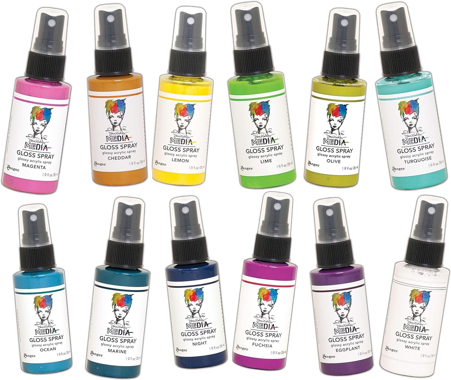 Dina Wakley MEdia Gloss Sprays by Ranger - Magenta, Cheddar, Lemon, Lime, Olive, Turquoise, Ocean, Marine, Night, Fuchsia, Eggplant, White, Bundle of 12 (1.9 Fl oz) Spray Bottles