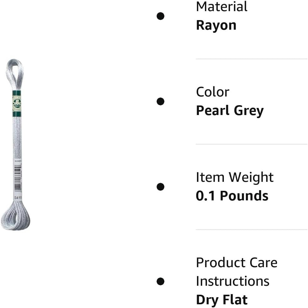 DMC satin floss is a shiny radiant thread made from 100-percent rayon fibers. It is the shiniest DMC thread available and it glides easily through fabric. The bright fibers of satin floss make this thread ideal for creating surface embroidery stitches which reflect light beautifully. Satin floss is comprised of 6 size 25 easily separated strands, allowing to adjust the thickness of stitching by using a different number of strands. It gives a wonderful brightness to all designs in traditional embroidery as well as in cross stitch. A shimmering brightness, a touch as soft as silk. In just a few stitches, satin gives a sheen to all designs. Its incredible soft touch will make stitching easy and pleasurable. Traditional embroidery, cross stitch the gleaming satin effect appears whatever the technique you use. The longer the stitches are, the thread will capture more light and the brightness will be more intense. In satin stitch or in flat stitch, the sheen of satin is clearly visible. In a few stitches, your tablecloths, napkins, cushions, bags and clothes are personalised with an elegant touch. After washing, gently wring it out and rinse it as many times as necessary to get the soap out of it, until the water is clear. Use almost cold water to rinse the piece. Wrap the embroidery in a towel to remove excess water, then dry flat. Place the embroidery on a clean towel, preferably while still damp, and iron on the reverse side, at the temperature setting recommended for the fabric. Available in pearl grey color bring radiance to designs. Measures 8.7-yard in size.