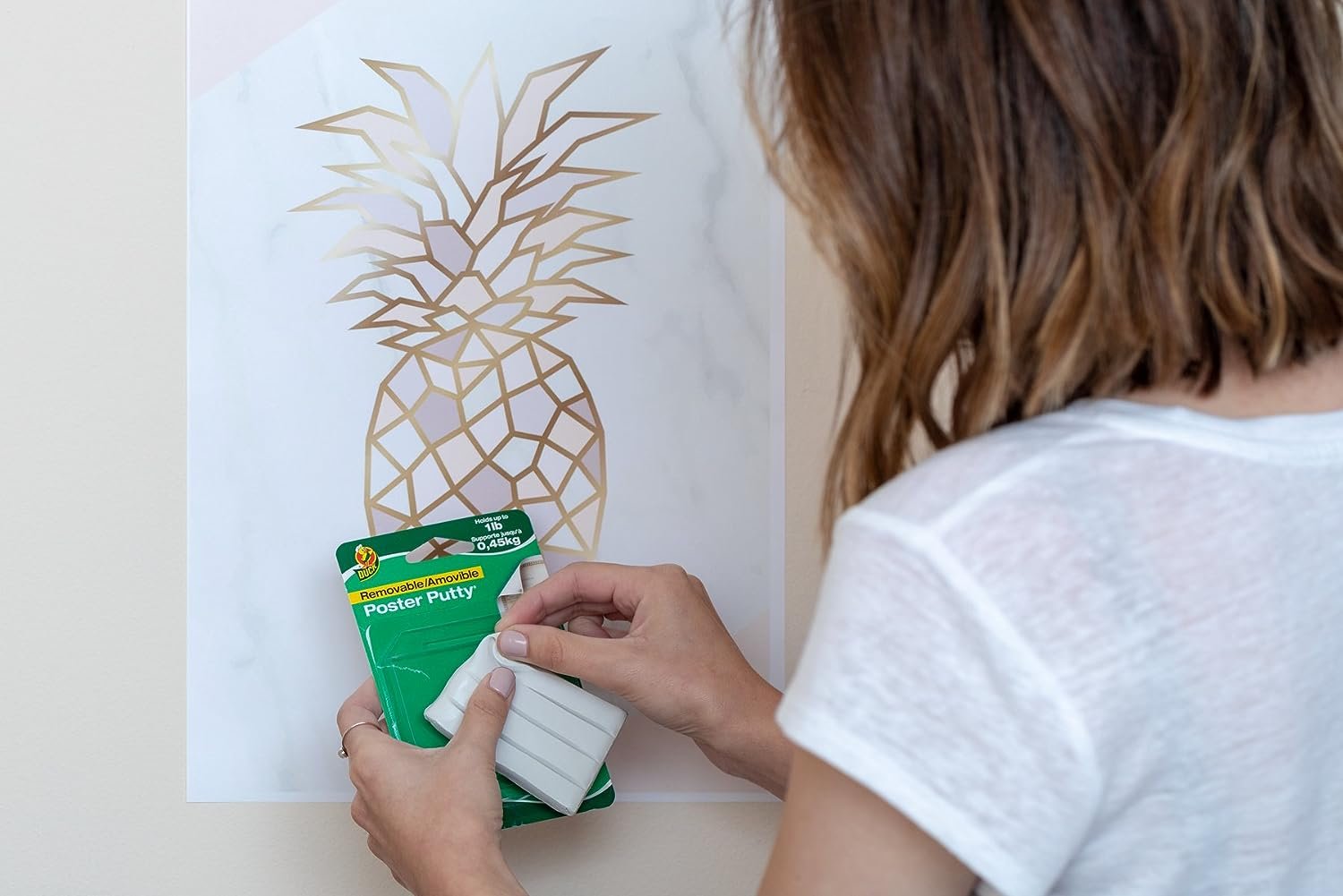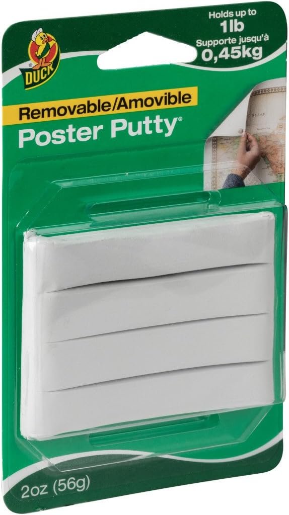 Great for temporary mounting of paper items such as posters, charts and decorations, Duck Brand Poster Putty is removable and reusable. It is a safe, clean alternative to tape, nails, glues, tacks and staples won't damage mounting surface and will not dry out. It is non-toxic and non-staining on most nonporous surfaces. This white putty holds up to 1 lb. and works with a variety of surfaces, but is not recommended for use on flocked or loose wallpaper and on peeling or fresh paint.