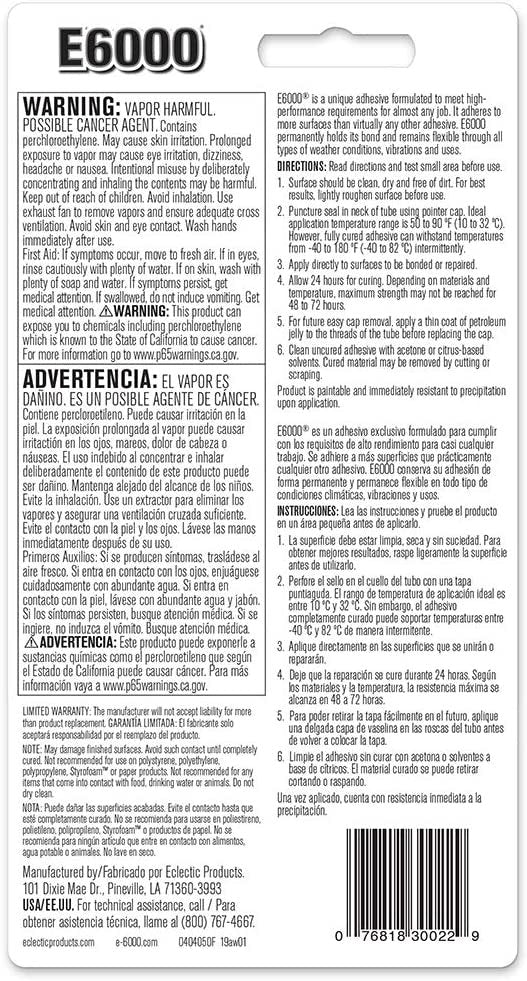 E6000 Multi-Purpose Adhesive. This glue is absolutely amazing. It permanently bonds: wood, metal, glass, fiberglass, ceramic, leather, rubber, vinyl and most plastics. E6000 is a unique adhesive formulated to meet high-performance industrial requirements, making it an exceptional craft adhesive. Features: water-proof, flexible, non-flammable, photo safe and paintable. Can even be used as potting material! Conforms to ASTM D4236. Clear formula. This package contains (1) 3.7oz tube. Made in USA.