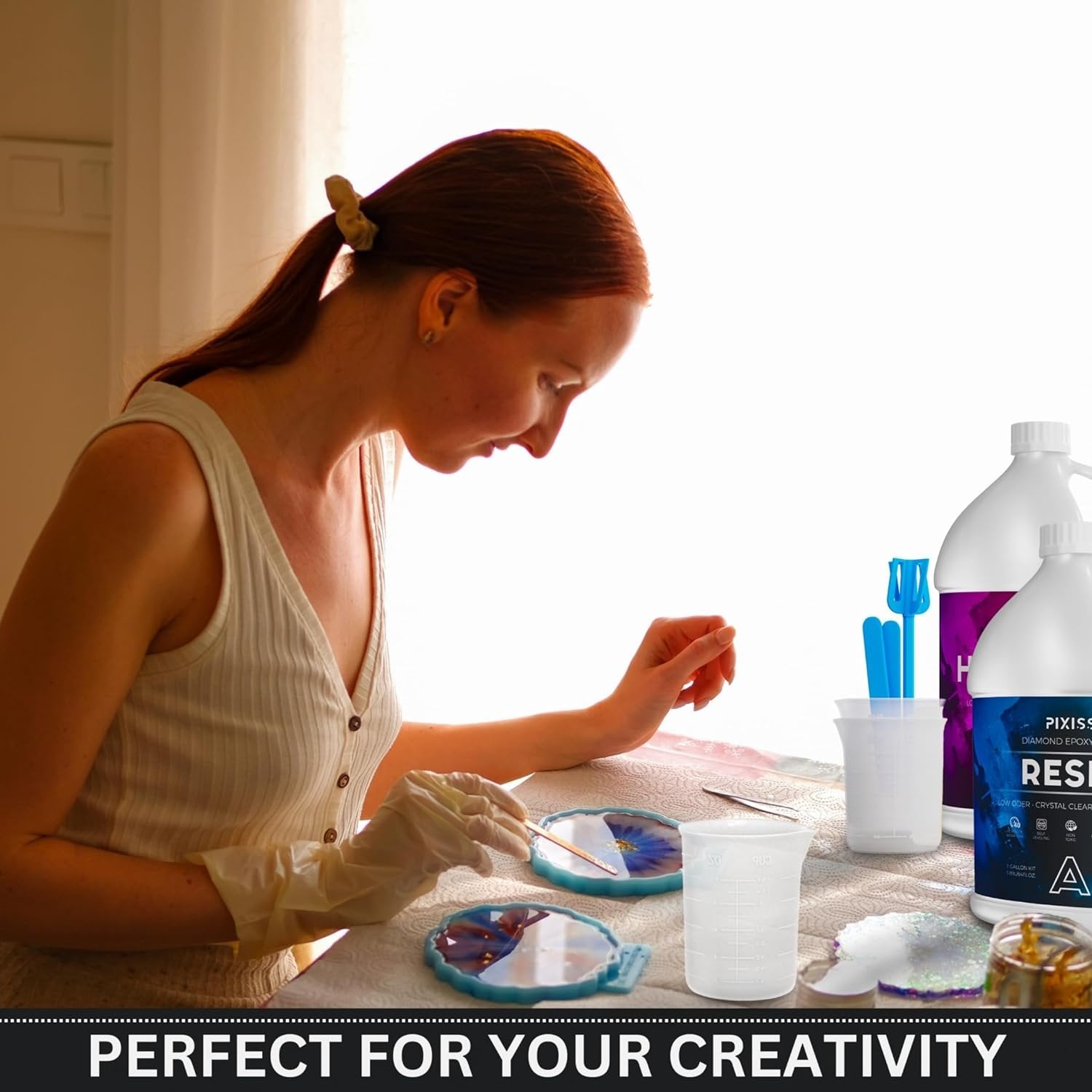 Our 6 gallon epoxy resin is formulated to offer a smooth and even finish, while the high gloss adds a stunning brilliance to your artwork. Say goodbye to yellowing over time with our anti-yellow formula, providing you with durable and long-lasting projects that will stand the test of time. Crafted with precision, our fast cure epoxy resin formula ensures clear, bubble-free results every time. Watch in awe as our casting resin transforms into a brilliant, glass-like finish that enhances the beauty of your creations. Whether you're in need of an outdoor epoxy resin, clear epoxy resin for wood or tumbler epoxy, our epoxy clear coat delivers unmatched clarity and depth. Let your imagination run wild with Pixiss Craft Resin. It's perfect for a wide range of resin products and projects. This includes: epoxy tables, resin jewelry, coasters, ashtrays, countertops, and more pour epoxy crafts Whether you're a passionate artist or simply looking to try a new hobby, our resin kits are here to help you unlock your creative potential. It includes everything you need to get started on your resin crafting journey. With a unique step-by-step guide, silicone mixing sticks, gloves, a silicone mixing paddle, a spreader, a silicone mat, and silicone beakers with measurement marks. Easy Mix 1:1 Ratio - Say goodbye to complicated measurements and calculations. Our Pixiss Epoxy Resin 6 Gallon Kit makes it incredibly easy for you. Simply mix equal parts A and B for 3-5 minutes, and you're ready to create! With a 30-minute work time and a 24-hour cure time, you'll have ample time to bring your vision to life without feeling rushed. Note: Be sure to refer to the included comprehensive instruction manual for proper handling and safety precautions.