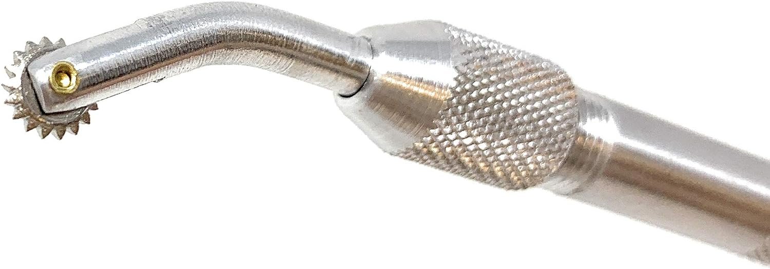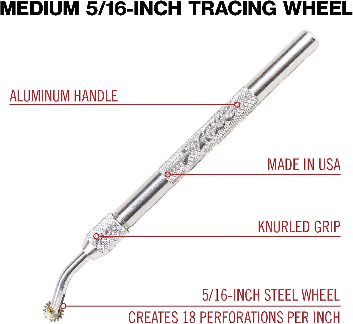 100% Made in the USA, aluminum handle with interchangeable heads. Perfect for hobby, arts and crafts and industrial uses. Used for tracing, pattern making, quilting, sewing, wood working and other transferring applications. The convenient set includes three different head sizes: 1/4" wheel (24 teeth per inch), 5/16" wheel (18 teeth per inch), 7/16" wheel (14 teeth per inch). Handle size 5" x 5/16".