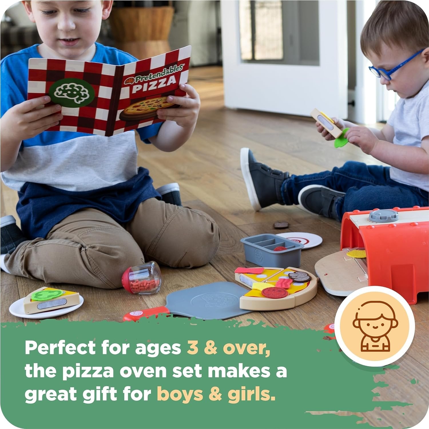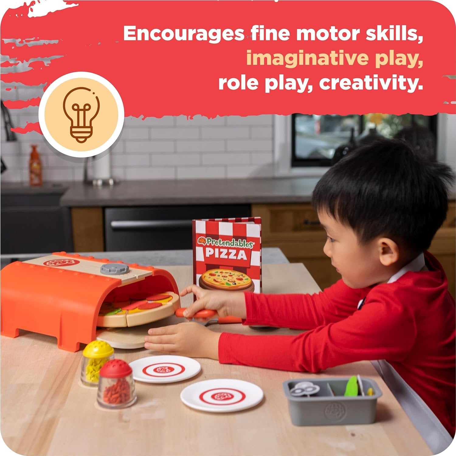 Featured on the Today Show, November 30th, 2023. Cook and serve the best pizza in town! The felt toppings stick to the hook-and-loop spots of the pizza slices. Use the peel to slide the pizza in and out of the oven, then use the pizza cutter and the spatula to serve it fresh onto the two plates for two hungry customers. Full tummies and big smiles all around! Just like a classic pepperoni pizza, kids are sure to love the Pretendables Pizza Set. Pretendables Pizza Set - Pretend pizza-baking set with oven that doubles as storage box - Encourages fine motor skills, imaginative play, role-play - Oven features opening lid with elastic clasp, clicking dial - Organize the felt toppings into the slots of the storage tray - Felt toppings attach to hook-and-loop spots of the pizza slices - Features menu and 2 plates - Open your own pizza shop! - Includes peel, 6 pizza slices, felt toppings, toppings tray, cheese and pepper shakers, pizza cutter, spatula, menu, 2 plates, oven/storage box - High-quality materials and construction - Lasting durability