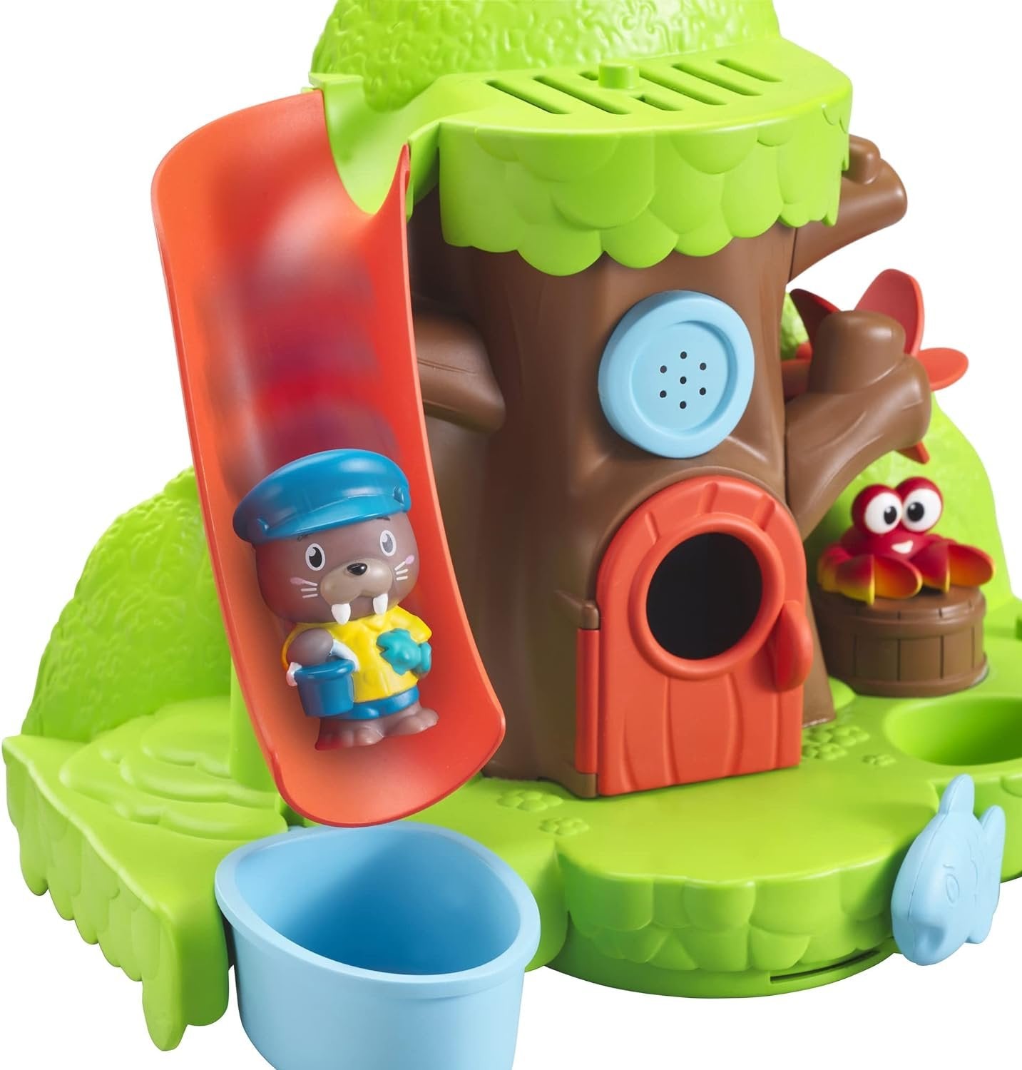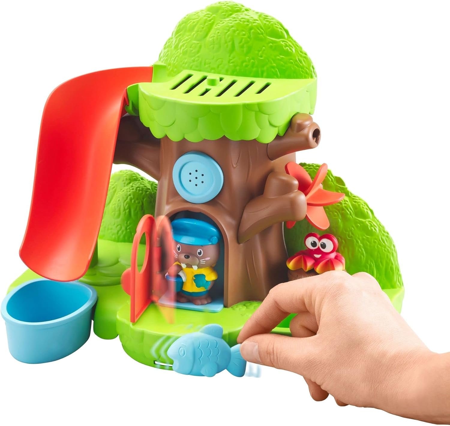 - Features a slide, a color-changing crab, a boat, and more; Slide the fish to open the door
