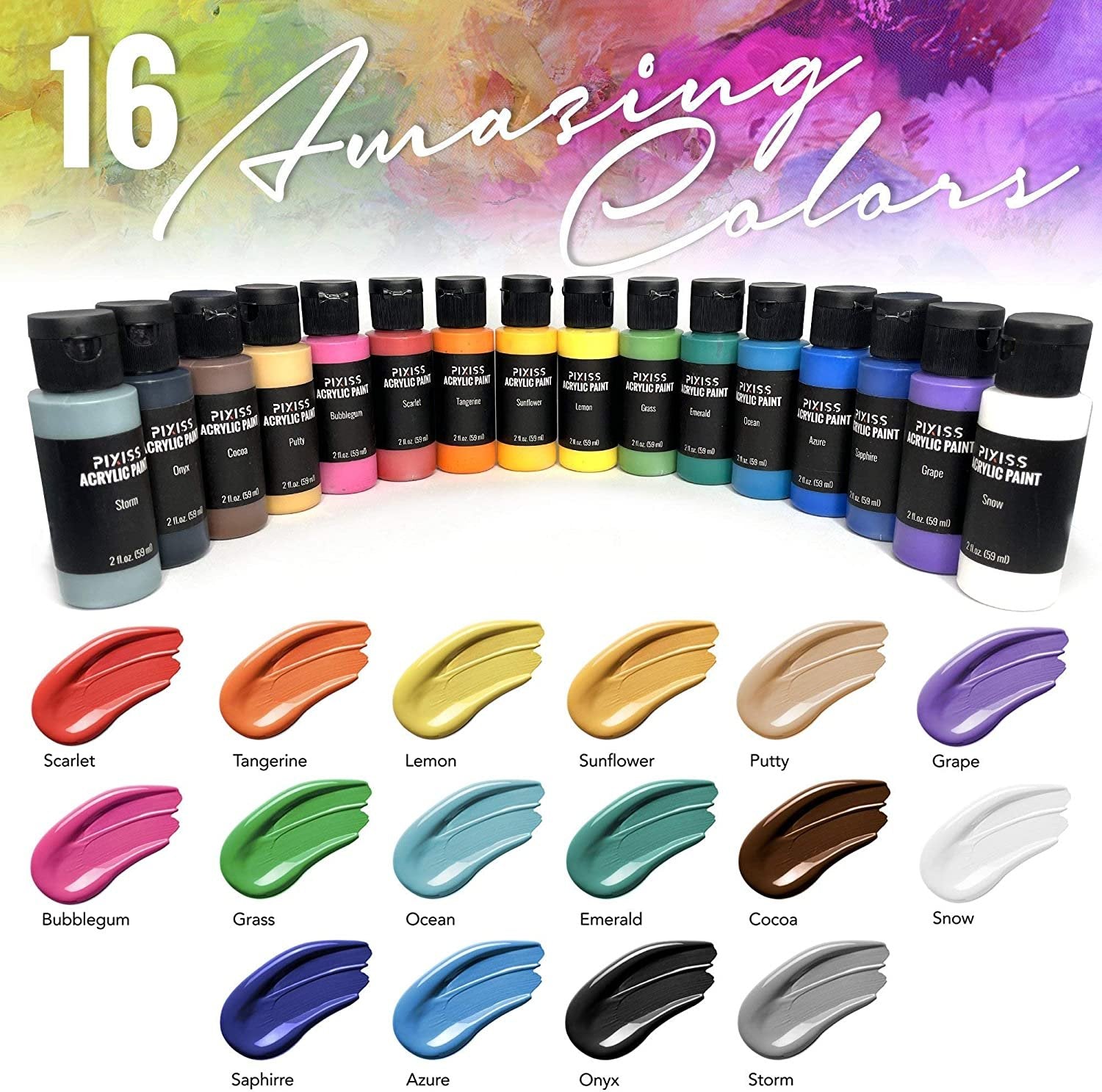 - Pixiss Acrylic Paints - 16 artist-quality colors.. 2 ounces each. With colors as dark as onyx or as vibrant as Ocean your art is sure to pop! Rich Lasting Beautiful Colors: Our premium acrylic paints are made specially to last, with rich and vivid pigmentation, not only will your art look amazing with true shades of color, but it will maintain that high quality look.