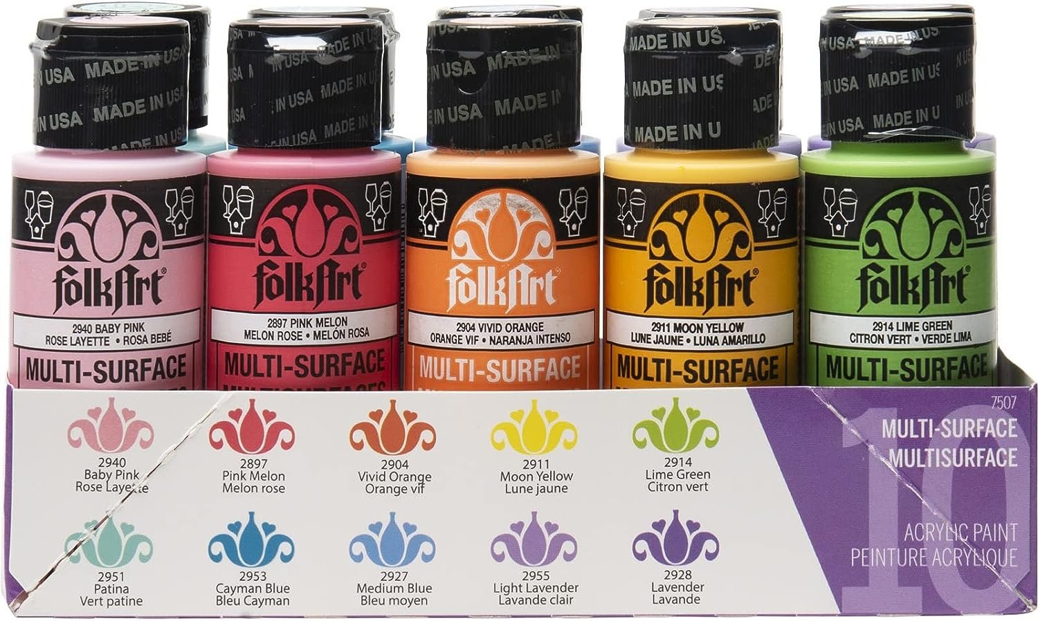 - VERSATILE & CONVENIENT SIZE - This multi-surface acrylic paint set includes 10 - 2 oz bottles of craft paint. The colors in the kit include: FolkArt Multi-Surface Baby Pink, Pink Melon, Vivid Orange, Moon Yellow, Lime Green, Patina, Cayman Blue, Medium Blue, Light Lavender, and Lavender
