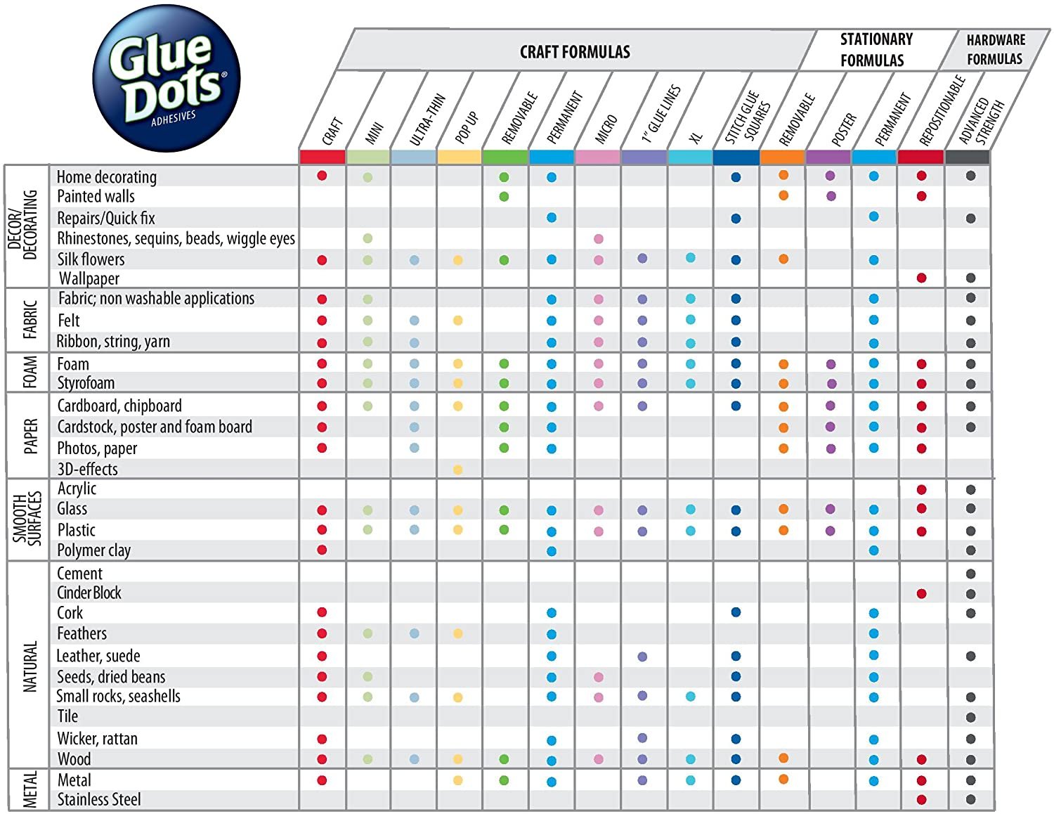 Glue Dots, the original ready-to-stick double-sided adhesive dots, are the clean and safe alternative to liquid glues, hot-melt glue guns, and tapes. They come in easy-to-use disposable applicators, rolls, and sheets. Glue Dots are also available in a wide range of temporary, permanent, and super-strength adhesive formulas that are specifically designed to make projects around your home, school, or office simpler. Our dots are easy to use regardless of age or ability, acid free, photo safe, non toxic, kid friendly, and mess free. Our dots are designed to work on a variety of materials including paper, glass, metal, plastic, wood, foam, cardstock, photos, and more. Glue Dots are the perfect adhesive solution to make your life easier.