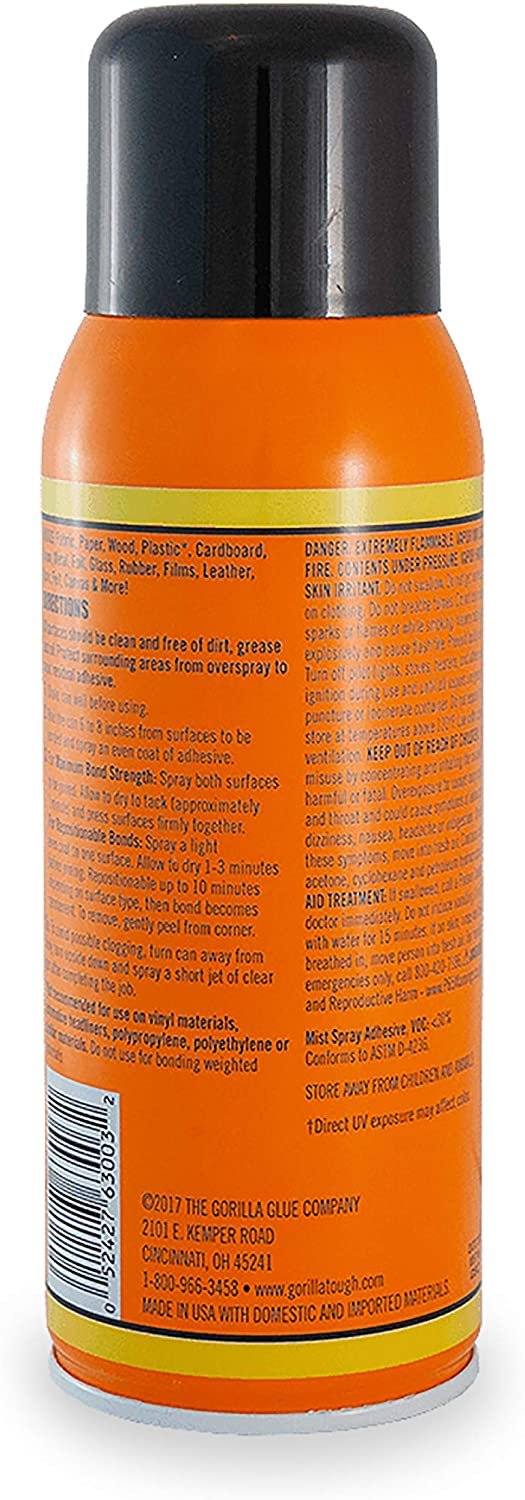 Gorilla Spray Adhesive is heavy duty, multi-purpose and easy to use. While repositionable for up to 10 minutes, Gorilla Spray adhesive forms a clear, permanent bond that is photo safe. Its wide pad nozzle and controlled fine mist provide an even application on the project you are working on. *Not recommended for use on vinyl materials, automotive headliners, polypropylene, polyethylene or similar materials. Do not use for bonding weighted materials.