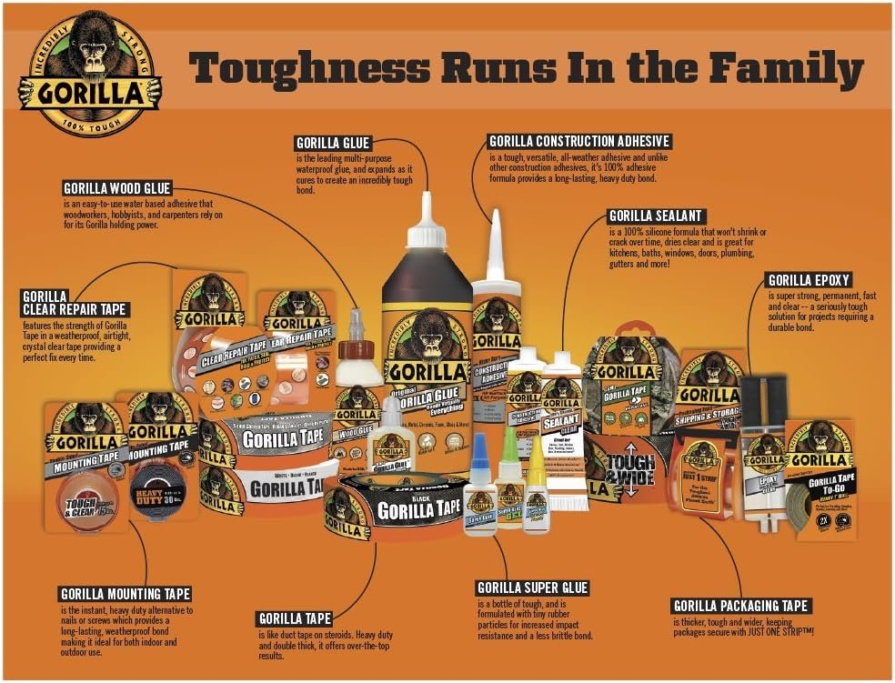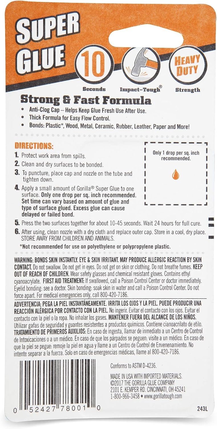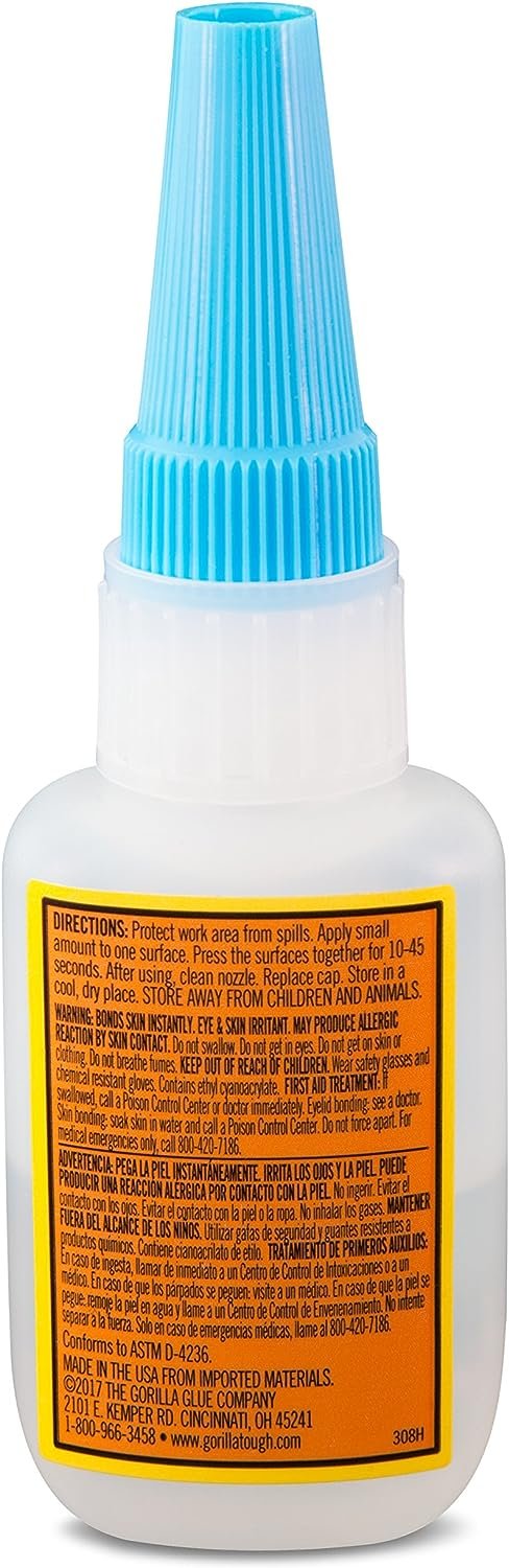 Its high strength and quick set time make Gorilla Super Glue the go-to adhesive for a variety of household projects. Developed for long-lasting repairs in an instant, the clear glue dries in 10-45 seconds. Our Super Glue is reinforced with rubber for increased impact resistance to handle bumps and drops. We call it Impact-Tough because the reliable bond stands up to wear and tear unlike any other instant glue. Super glue, also referred to as cyanoacrylate glue, or CA glue, works on a variety of materials, including plastic, metal, fabric, stone, ceramic, paper, rubber and more. In addition to Gorilla Super Glue's high-performance cyanoacrylate formula, we've added an anti-clog cap with a metal pin inside ensuring an airtight seal for maximum reusability. It's Gorilla tough, every time. For high performance and usability, the adhesive needs to be protected from air. One way keep the air out of the adhesive is by packaging in thick plastic bottles. Because of this thick plastic bottle, it might appear that the bottle is only half full when new. The bottle is not completely filled on purpose to make it easier to squeeze the glue out. Gorilla Super Glue should not be used for intentional contact with the skin. Click on the Gorilla link at the top of this page to see other quality products from the Gorilla Glue Company.