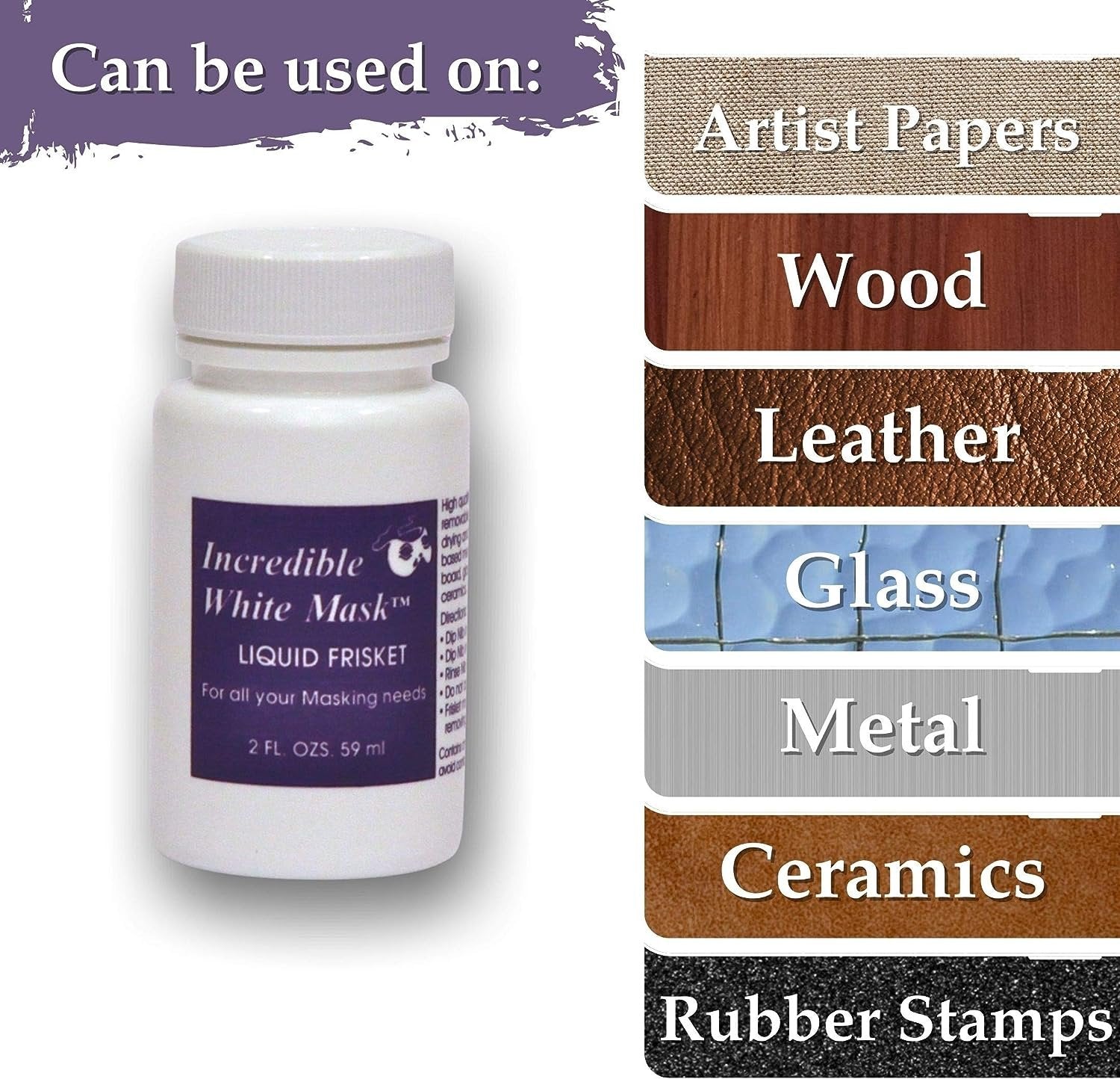 GRAFIX-Incredible White Mask Kit. This Incredible White Mask kit contains all you need for using liquid frisket, Incredible White Mask, Nib and Pick Up Tool along with a helpful tips and techniques brochure. This package contains one 2 fl. ounce/59 ml of frisket, one 5-1/4 inch nib and rubber cement pick up tool. Made in USA.