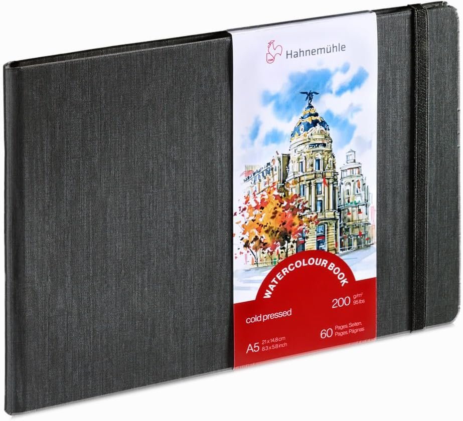 This Hahnemuhle Watercolor Book size A5 features high quality, 200gsm, fine grain watercolor paper. The watercolor book contains 30 sheets/60 pages making it compact enough to travel with, yet offering an ample amount space for all of your artwork. With a hard bound, durable cover and elastic enclosure this A5 sized book in landscape format measures 5.8x8.3 inches. The ideal companion for any artist, the Hahnemuhle Watercolor Book is perfect for capturing, landscapes, urban scenes, and everyday life wherever you go.