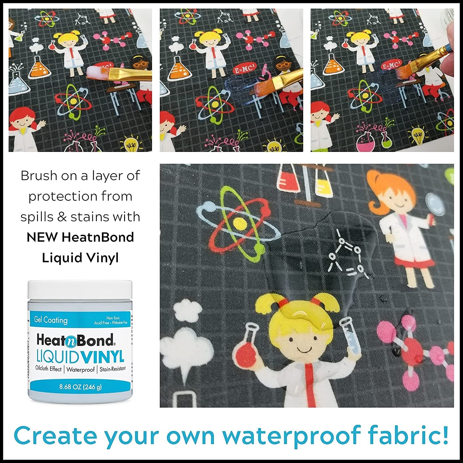 Make your favorite fabrics stain-resistant, water-resistant and even waterproof with new HeatnBond Liquid Vinyl from Therm O Web. Simply paint on a thin layer, let dry and then iron to create a smooth, protective finish. Create different effects, including a semi-gloss oilcloth look, by applying multiple layers. Treated fabrics maintain a very soft hand, perfect for any project from apparel to home decor. Use on wearables like ponchos, backpacks as well as placemats, tote bags, and more! Oilcloth effect. Stain-Resistant. Waterproof. Clear and flexible once dry. Can be machine sewn. Wipes clean with a damp cloth. Nontoxic & Phthalate Free. This package contains 8.68 ounces of liquid vinyl. Made in the USA.