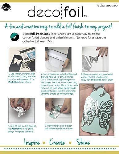 Deco Foil PeelnStick Toner Sheets are a great way to create custom foiled designs and embellishments. Simply use scissors, punches, dies or an electronic Cutting machine to cut any shape, layer with Deco Foil transfer sheets and run through a laminator. No need for a separate adhesive, just peel n stick.