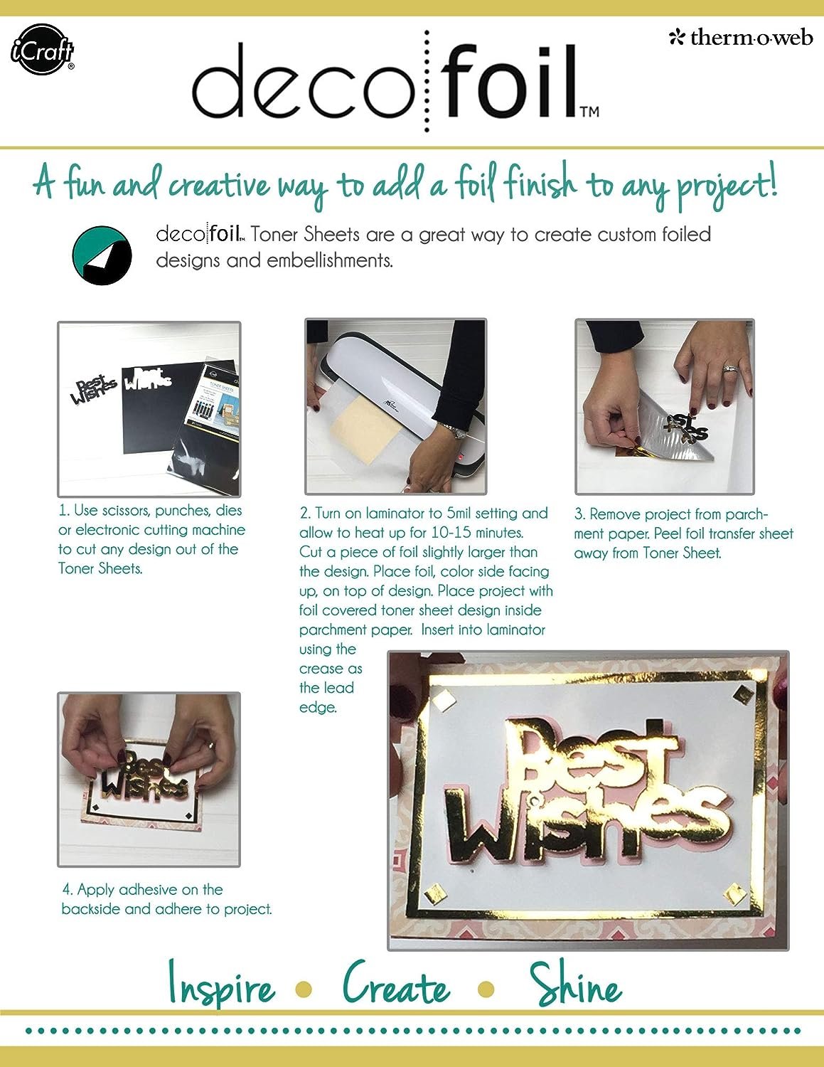 Deco Foil Toner Sheets are heat-activated transfer papers used to create custom designs and embellishments. Use with Deco Foil Transfer Sheets (sold separately) to quickly and easily add a foil finish to your project. Simply use scissors, punches, dies or an electronic cutting machine to cut any shape. Layer with Deco Foil Transfer Sheets (sold separately) and run through a hot laminator. Apply adhesive, such as a Zot or mounting square (not included), and place on your project. Deco Foil Toner Sheets do not have an adhesive backing; anytime you want to create a dimensional effect, use Deco Foil Toner Sheets. If you want your design to lay completely flat, try Deco Foil PeelnStick Toner Sheets that have an adhesive backing.