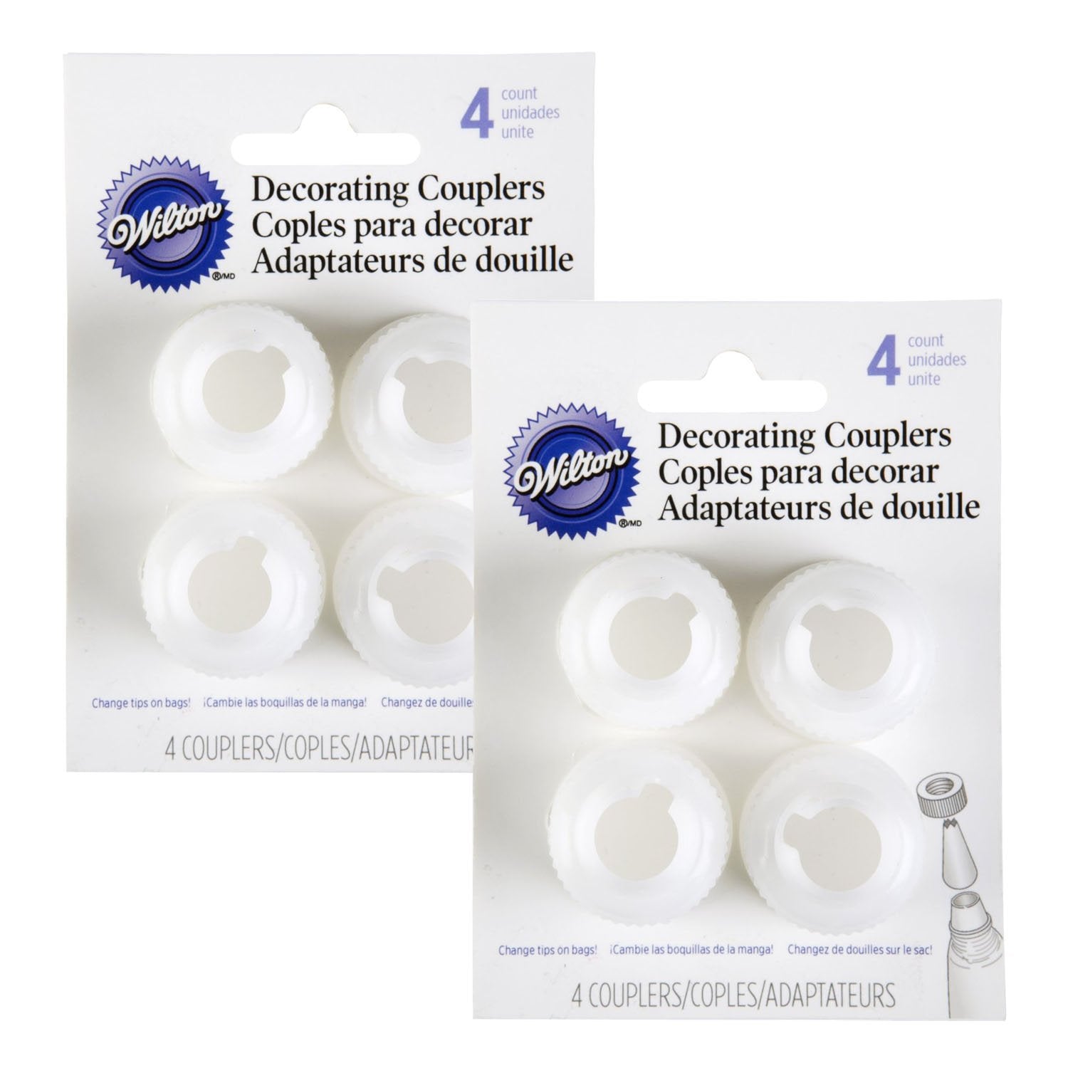 This set of 8 couplers are a perfect accessory for any chef! The couplers are designed to fit on the end of a frosting bag so replacing tips is easy and mess free! The set of 8 couplers is divided into two sets of 4 couplers packaged individually, which makes them great for giving as a gift, or for having spares in case some get lost!
