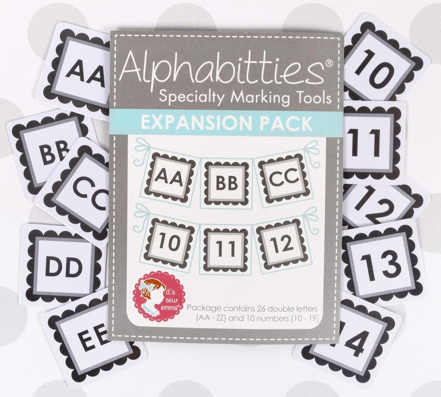 The Alphabitties Expansion Pack from It's Sew Emma goes beyond A-Z with tiles for AA-ZZ and 10-19. Pairs perfectly with It's Sew Emma patterns and the original Alphabitties marking tools.