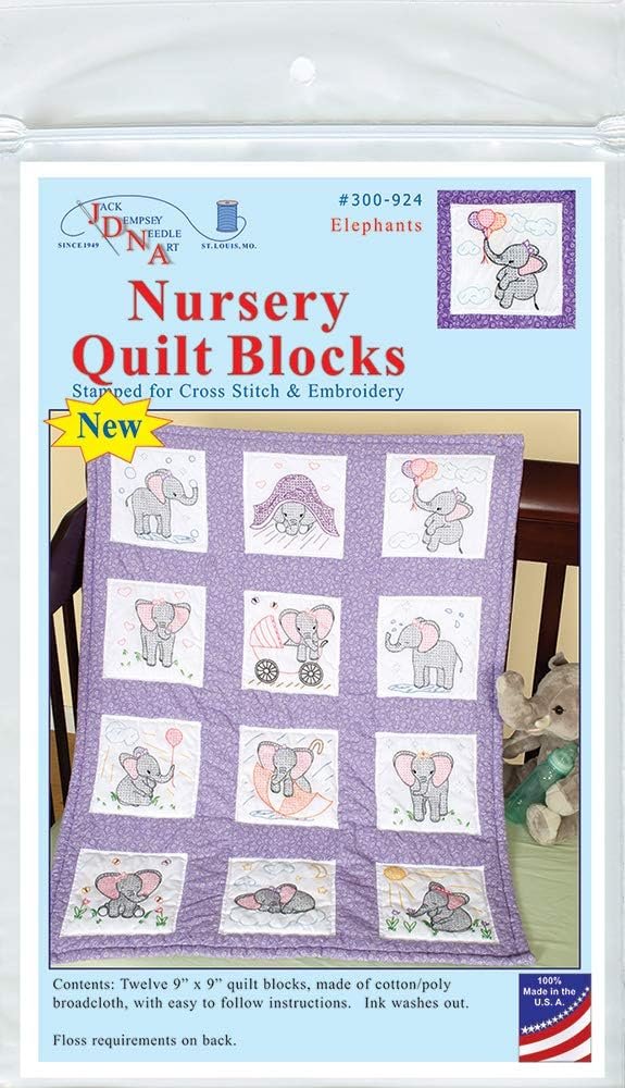 Jack Dempsey Needle Art: Elephants nursery quilt blocks. This package contains twelve 9 inch white cotton/poly quilt blocks stamped with ink that washes out; floss requirements list and complete instructions. Additional materials needed to complete: backing, batting, hoop, needle and floss.
