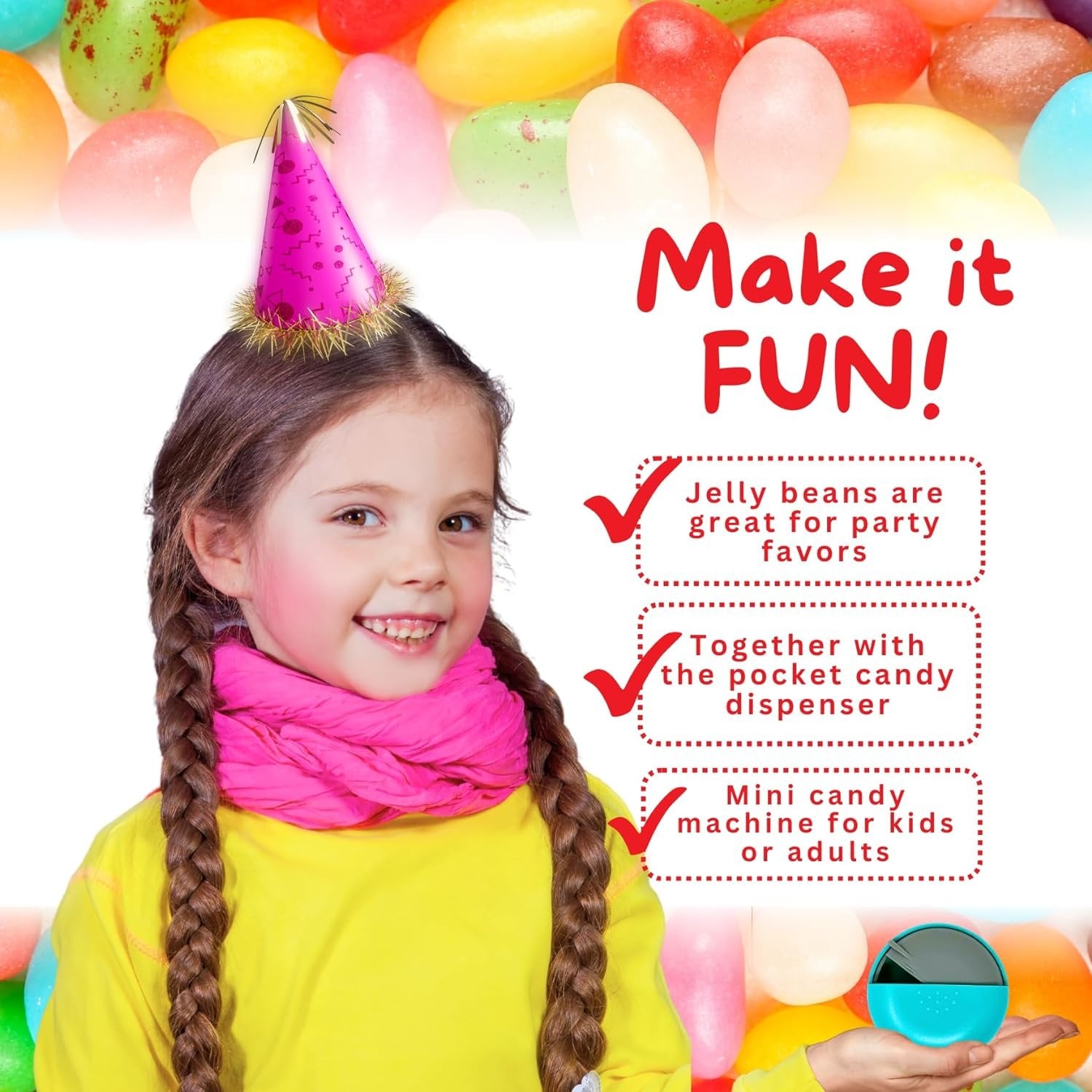 - Flimsy Candy Packs Fall Apart - So opt for our sleek dispenser. Compact and stylish with a rotating lid that clicks shut. Easily fits in pockets and stores the added Jelly Beans candy for a sweet treat.
