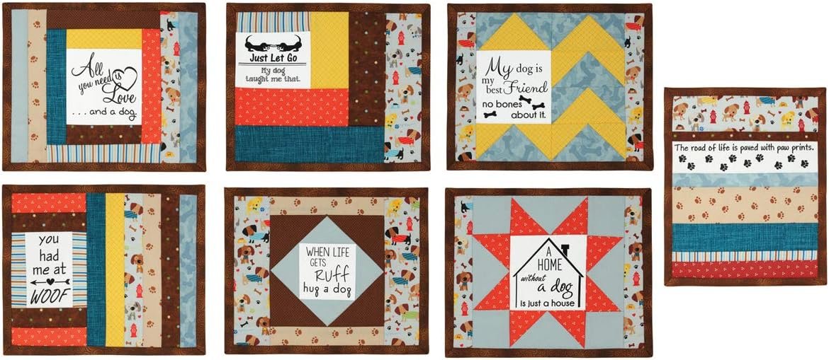 - Seven patterns printed on cotton/poly batting and seven dog-themed statements printed on a quilting cotton.