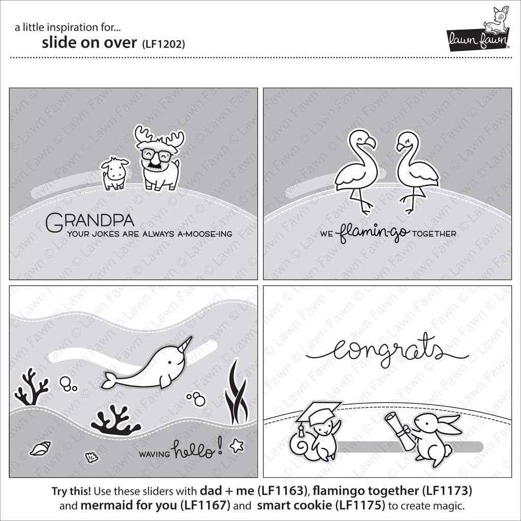 Add a whole new level of cuteness and interactive fun to your projects with these sliders! The curved sliders coordinate perfectly with Lawn Fawn Dies - Simple Stitched Hillside Borders (LF1054) and Lawn Fawn Dies - Stitched Hillside Borders (LF772). Use the curvy slider with Lawn Fawn Clear Stamps - Yay, Kites (LF1169)! for an interactive card with a kite sliding along a "string." Or use it with Lawn Fawn Clear Stamps - Mermaid for You (LF1167) for a cute scene with a narwhal or mermaid "swimming" across the card. This set is also the perfect way to have a critter from Lawn Fawn Clear Stamps - Dad + Me (LF1163), or any critter set, "slide on over" to their friend. Check out the entire Lawn Fawn Slide on Over collection! Lawn Fawn Dies are high-quality steel, made in the USA, and are compatible with most die-cutting machines! Approximate Die Sizes: 1. Longer straight slide 3/8" x 3 7/8" 2. Shorter straight slide 1/4" x 2 1/4"