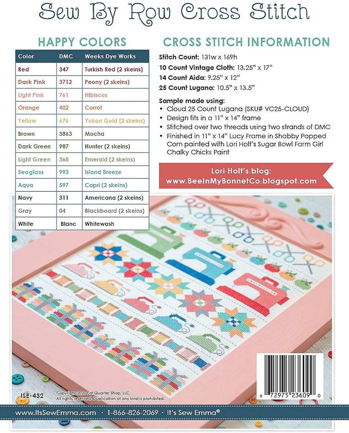 Lori Holt's hit Sew by Row sampler quilt has crossed over as a cross stitch! Enjoy these adorable motifs by Bee in my Bonnet Co., such as scissors, sewing machines, irons, and fat quarter bundles. There is no way you can resist the itch to stitch up this darling cross stitch! The Sew by Row Cross Stitch Pattern comes with full-color instructions, diagrams, and supply list, including suggested DMC and Weeks Dye Works colors. The cross stitch is designed to work on 25-count Lugana and finishes at 10.5 in x 13.5 in. Stitch count: 131w x 169h